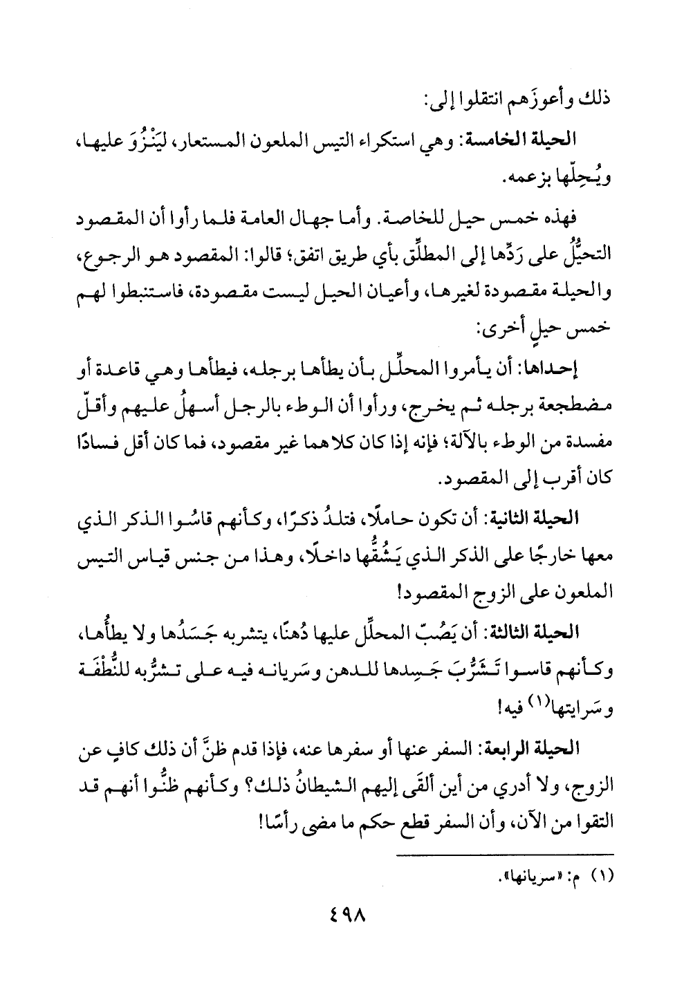 الحيلة الثالثة: أن يَصُبّ المحلِّل عليها دُهنًا، يتشربه جَسَدُها ولا يطأُها، وكأنهم قاسوا تَشَرُّبَ جَسِدها للدهن وسَريانه فيه على تشرُّبه للنُّطْفَة وسَرايتها (¬1) فيه!