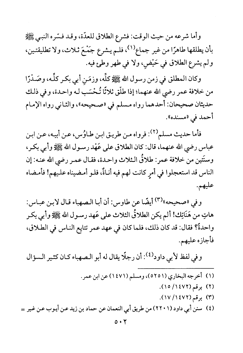 وكان المطلق في زمن رسول الله - صلى الله عليه وسلم - كلِّه، وزمَنِ أبي بكر كلِّه، وصَدْرًا من خلافة عمر رضي الله عنهما؛ إذا طلّق ثلاثًا تُحْسَب له واحدة، وفي ذلك حديثان صحيحان: أحدهما رواه مسلم في "صحيحه"، والثاني رواه الإمام أحمد في "مسنده".