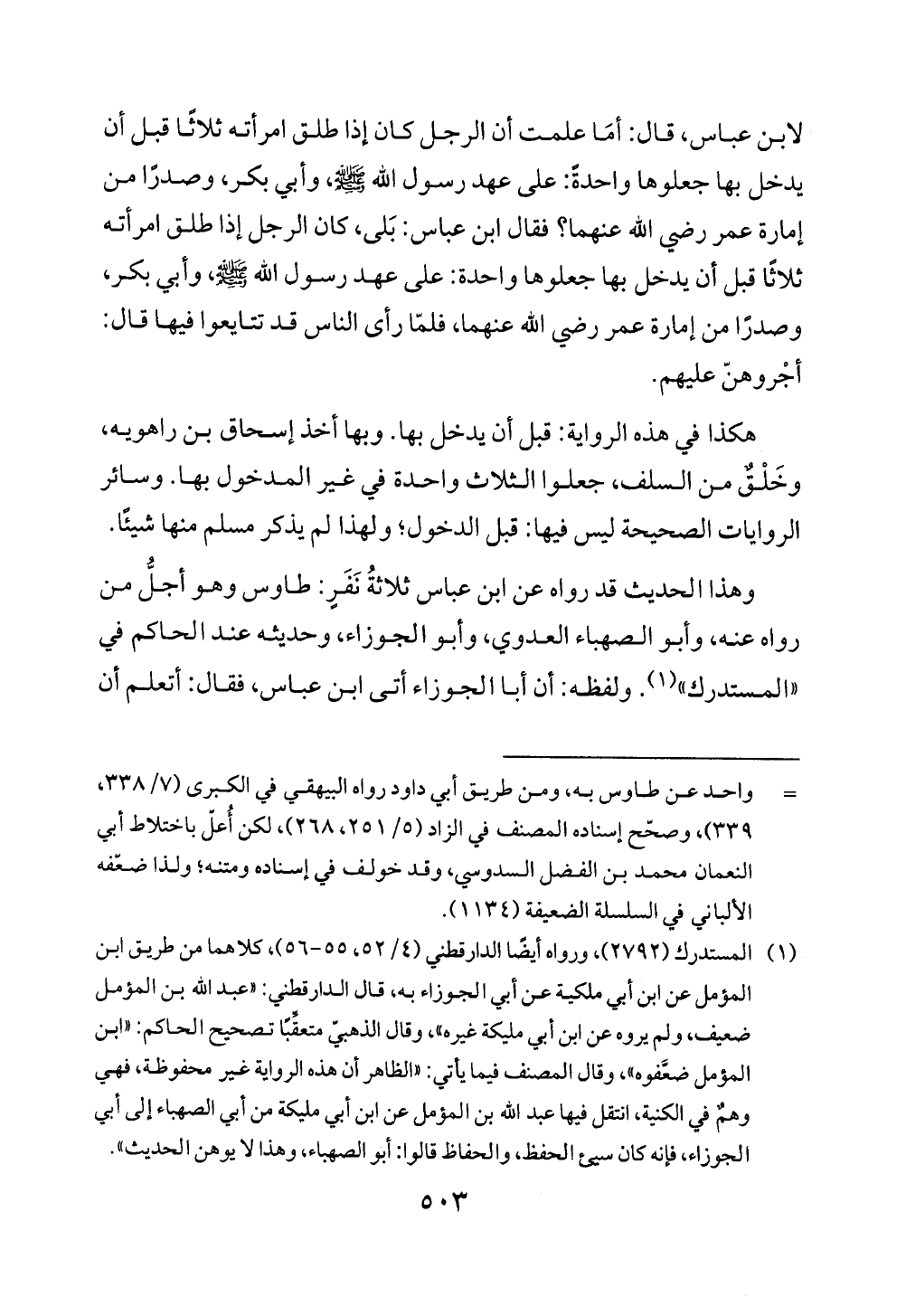 لابن عباس، قال: أمَا علمت أن الرجل كان إذا طلق امرأته ثلاثًا قبل أن يدخل بها جعلوها واحدةً: على عهد رسول الله - صلى الله عليه وسلم -، وأبي بكر، وصدرًا من إمارة عمر رضي الله عنهما؛ فقال ابن عباس: بَلى، كان الرجل إذا طلق امرأته ثلاثًا قبل أن يدخل بها جعلوها واحدة: على عهد رسول الله - صلى الله عليه وسلم -، وأبي بكر، وصدرًا من إمارة عمر رضي الله عنهما، فلمّا رأى الناس قد تتايعوا فيها قال: أجْروهنّ عليهم،