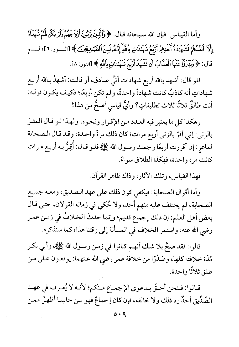 فلو قال: أشهد بالله أربع شهادات أنيِّ صادق، أو قالت: أشهدُ بالله أربع شهاداتٍ أنه كاذبٌ كانت شهادةً واحدةً، ولم تكن أربعًا؛ فكيف يكون قوله: أنت طالقٌ ثلاثًا ثلاث تطليقاتٍ؟ وأيُّ قياسٍ أصحُّ من هذا؟