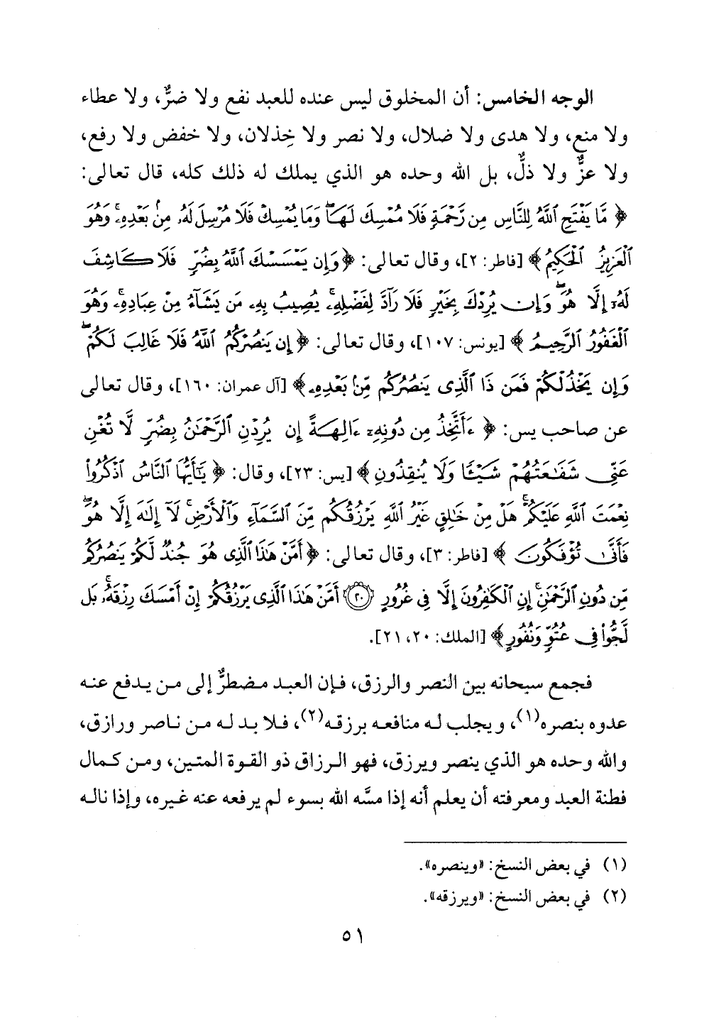 الوجه الخامس: أن المخلوق ليس عنده للعبد نفع ولا ضرٌّ، ولا عطاء ولا منع، ولا هدى ولا ضلال، ولا نصر ولا خِذلان، ولا خفض ولا رفع، ولا عزٌّ ولا ذلٌّ، بل الله وحده هو الذي يملك له ذلك كله، قال تعالى: {مَا يَفْتَحِ اللَّهُ لِلنَّاسِ مِنْ رَحْمَةٍ فَلَا مُمْسِكَ لَهَا وَمَا يُمْسِكْ فَلَا مُرْسِلَ لَهُ مِنْ بَعْدِهِ وَهُوَ الْعَزِيزُ الْحَكِيمُ} [فاطر: 2]، وقال تعالى: {وَإِنْ يَمْسَسْكَ اللَّهُ بِضُرٍّ فَلَا كَاشِفَ لَهُ إِلَّا هُوَ وَإِنْ يُرِدْكَ بِخَيْرٍ فَلَا رَادَّ لِفَضْلِهِ يُصِيبُ بِهِ مَنْ يَشَاءُ مِنْ عِبَادِهِ وَهُوَ الْغَفُورُ الرَّحِيمُ} [يونس: 107]، وقال تعالى: {إِنْ يَنْصُرْكُمُ اللَّهُ فَلَا غَالِبَ لَكُمْ وَإِنْ يَخْذُلْكُمْ فَمَنْ ذَا الَّذِي يَنْصُرُكُمْ مِنْ بَعْدِهِ} [آل عمران: 160]، وقال تعالى عن صاحب يس: {أَأَتَّخِذُ مِنْ دُونِهِ آلِهَةً إِنْ يُرِدْنِ الرَّحْمَنُ بِضُرٍّ لَا تُغْنِ عَنِّي شَفَاعَتُهُمْ شَيْئًا وَلَا يُنْقِذُونِ} [يس: 23]، وقال: {يَاأَيُّهَا النَّاسُ اذْكُرُوا نِعْمَتَ اللَّهِ عَلَيْكُمْ هَلْ مِنْ خَالِقٍ غَيْرُ اللَّهِ يَرْزُقُكُمْ مِنَ السَّمَاءِ وَالْأَرْضِ لَا إِلَهَ إِلَّا هُوَ فَأَنَّى تُؤْفَكُونَ} [فاطر: 3]، وقال تعالى: {أَمَّنْ هَذَا الَّذِي هُوَ جُنْدٌ لَكُمْ يَنْصُرُكُمْ مِنْ دُونِ الرَّحْمَنِ إِنِ الْكَافِرُونَ إِلَّا فِي غُرُورٍ (20) أَمَّنْ هَذَا الَّذِي يَرْزُقُكُمْ إِنْ أَمْسَكَ رِزْقَهُ بَلْ لَجُّوا فِي عُتُوٍّ وَنُفُورٍ} [الملك: 20، 21].