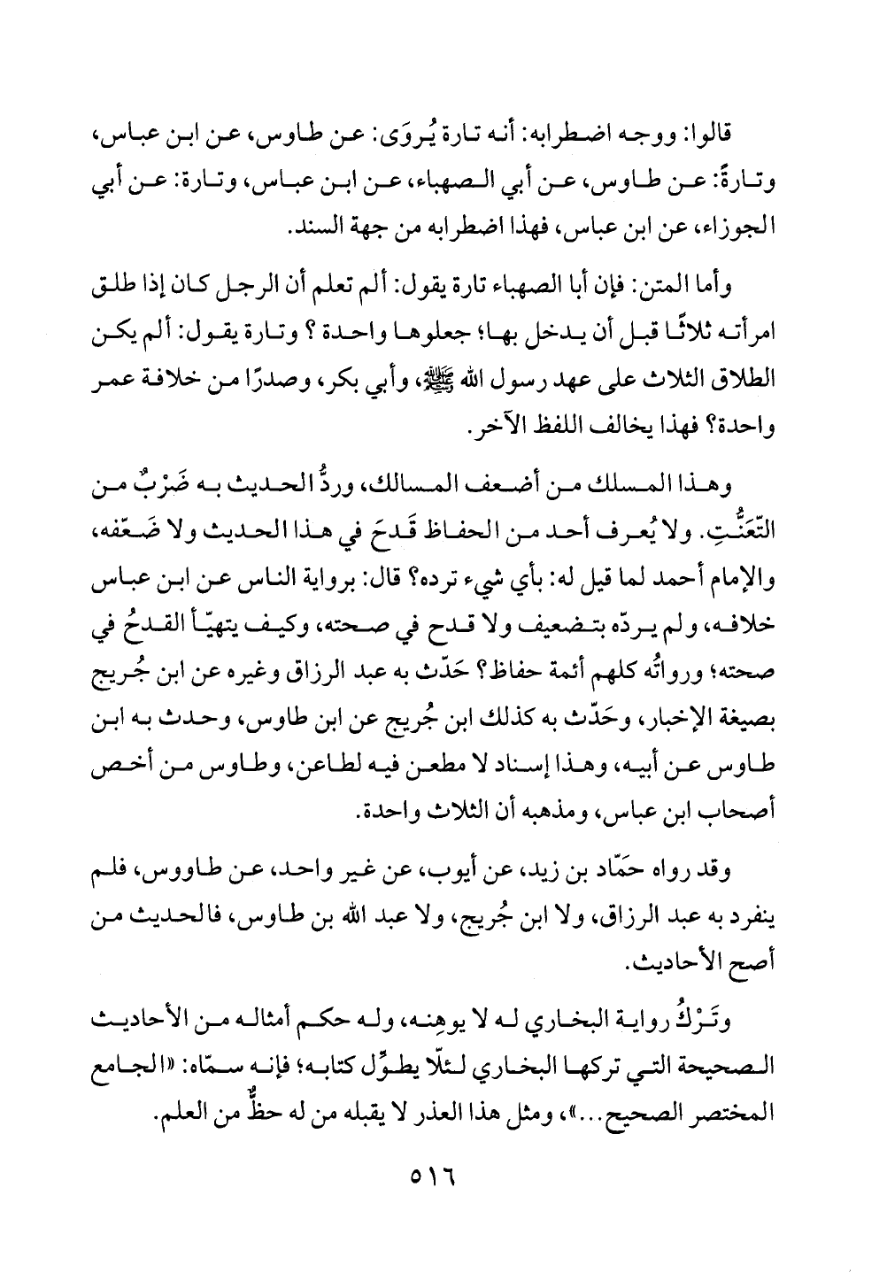 وهذا المسلك من أضعف المسالك، وردُّ الحديث به ضَرْبٌ من التّعَنُّتِ. ولا يُعرف أحد من الحفاظ قَدحَ في هذا الحديث ولا ضَعّفه، والإمام أحمد لما قيل له: بأي شيء ترده؟ قال: برواية الناس عن ابن عباس خلافه، ولم يردّه بتضعيف ولا قدح في صحته، وكيف يتهيّا القدحُ في صحته؛ ورواتُه كلهم أئمة حفاظ؟ حَدّث به عبد الرزاق وغيره عن ابن جُريج بصيغة الإخبار، وحَدّث به كذلك ابن جُريج عن ابن طاوس، وحدث به ابن طاوس عن أبيه، وهذا إسناد لا مطعن فيه لطاعن، وطاوس من أخص أصحاب ابن عباس، ومذهبه أن الثلاث واحدة.