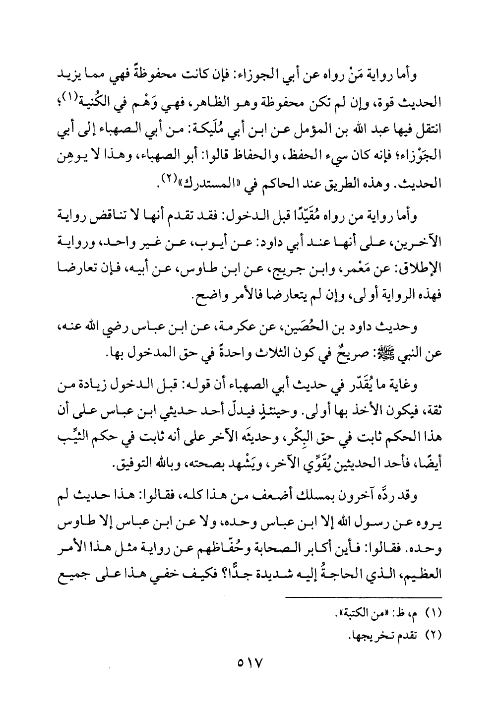وغاية ما يُقَدّر في حديث أبي الصهباء أن قوله: قبل الدخول زيادة من ثقة، فيكون الأخذ بها أولى. وحينئذٍ فيدلّ أحد حديثي ابن عباس على أن هذا الحكم ثابت في حق البِكْر، وحديثَه الآخر على أنه ثابت في حكم الثيِّب أيضا، فأحد الحديثين يُقَوِّي الآخر، ويَشْهد بصحته، وبالله التوفيق.