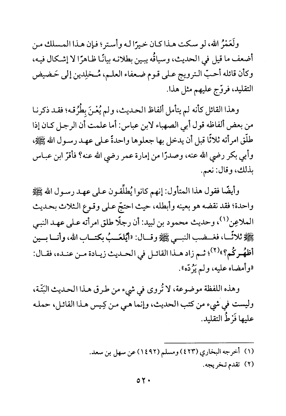 وهذا القائل كأنه لم يتأمل ألفاظ الحديث، ولم يُعْنَ بطُرُقه؛ فقد ذكرنا من بعض ألفاظه قول أبي الصهباء لابن عباس: أما علمت أَن الرجل كان إذا طلّق امرأته ثلاثا قبل أن يدخل بها جعلوها واحدة على عهد رسول الله - صلى الله عليه وسلم -، وأبي بكر رضي الله عنه، وصدرًا من إمارة عمر رضي الله عنه؛ فأقرّ ابن عباس بذلك، وقال: نعم.