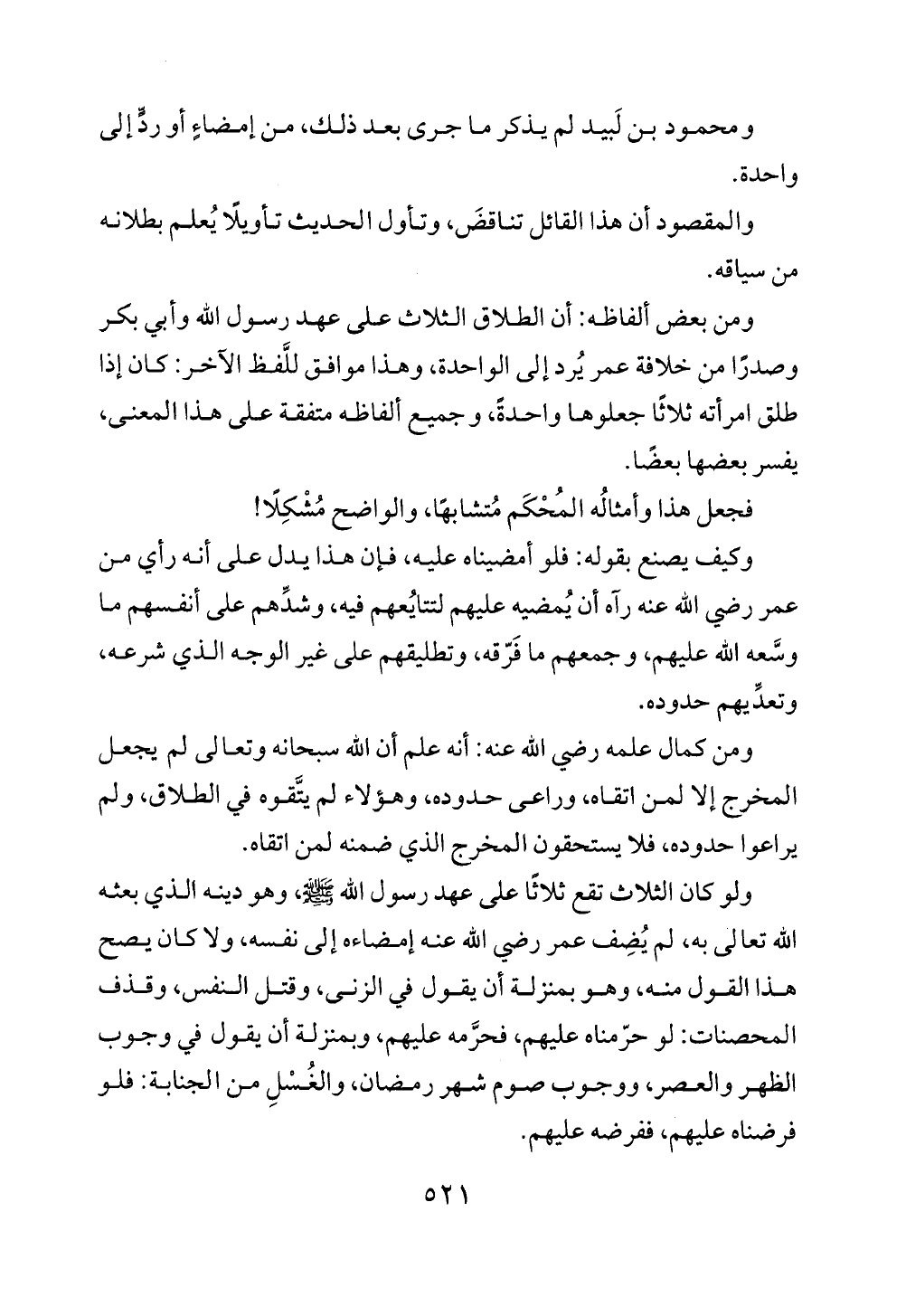 ولو كان الثلاث تقع ثلاثًا على عهد رسول الله - صلى الله عليه وسلم -، وهو دينه الذي بعثه الله تعالى به، لم يُضِف عمر رضي الله عنه إمضاءه إلى نفسه، ولا كان يصح هذا القول منه، وهو بمنزلة أن يقول في الزنى، وقتل النفس، وقذف المحصنات: لو حرّمناه عليهم، فحرَّمه عليهم، وبمنزلة أن يقول في وجوب الظهر والعصر، ووجوب صوم شهر رمضان، والغُسْلِ من الجنابة: فلو فرضناه عليهم، ففرضه عليهم.