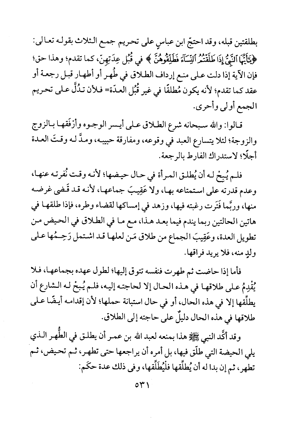 وقد أكَّد النبي - صلى الله عليه وسلم - هذا بمنعه لعبد الله بن عمر أن يطلق في الطّهر الذي يلي الحيضة التي طلّق فيها، بل أمره أن يراجعها حتى تطهر، ثم تحيض، ثم تطهر، ثم إن بدا له أن يُطلِّقها فلْيُطَلِّقها، وفى ذلك عدة حكَم: