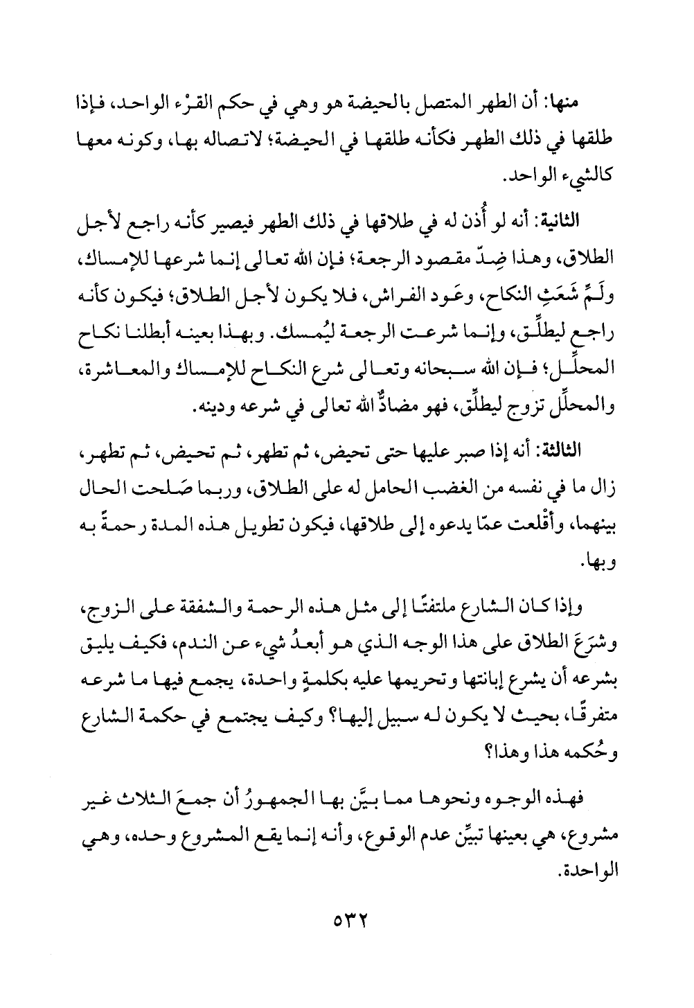 وإذا كان الشارع ملتفتًا إلى مثل هذه الرحمة والشفقة على الزوج، وشرَعَ الطلاق على هذا الوجه الذي هو أبعدُ شيء عن الندم، فكيف يليق بشرعه أن يشرع إبانتها وتحريمها عليه بكلمة واحدة، يجمع فيها ما شرعه متفرقًا، بحيث لا يكون له سبيل إليها؟ وكيف يجتمع في حكمة الشارع وحُكمه هذا وهذا؟