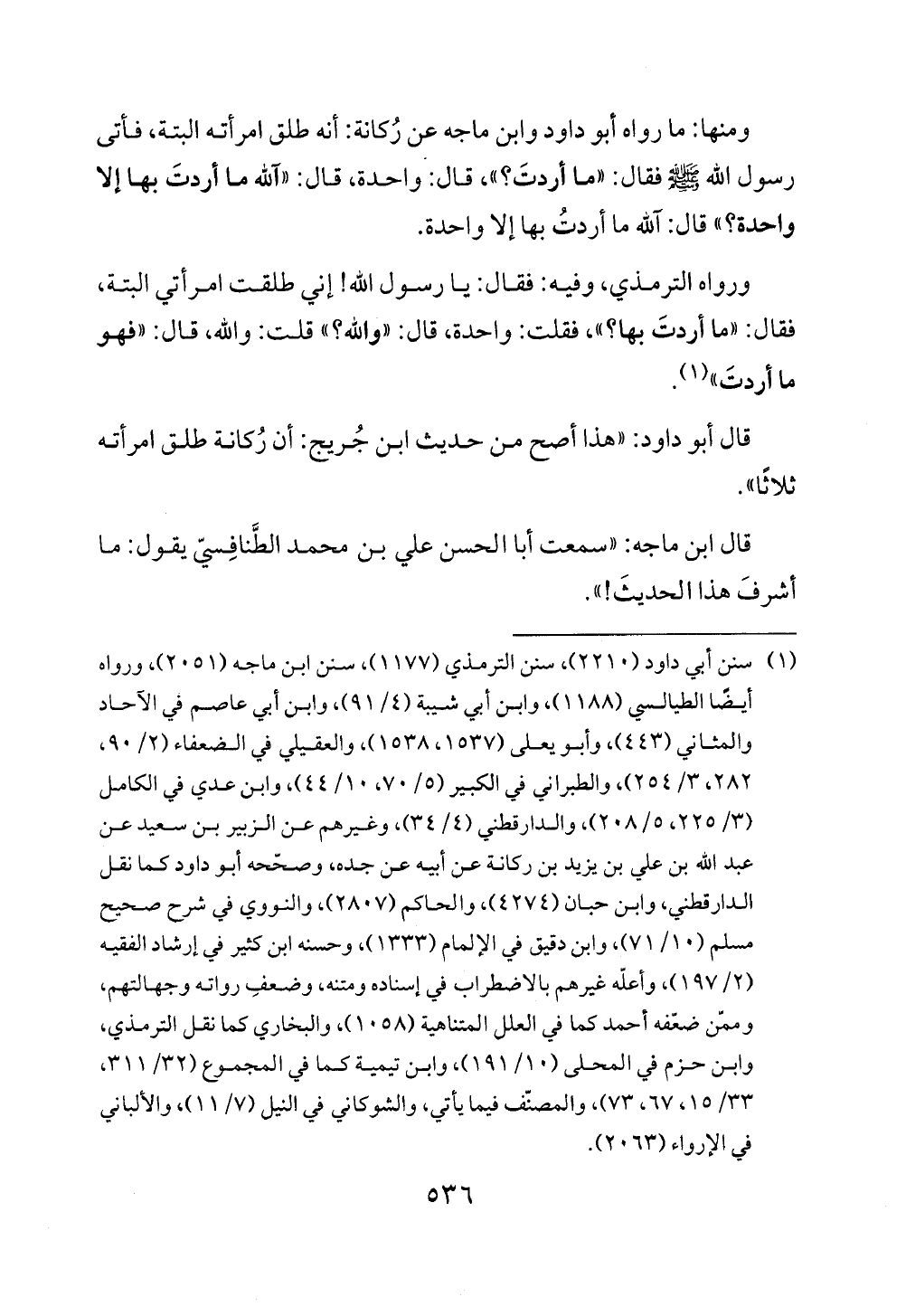(¬1) سنن أبي داود (2210)، سنن الترمذي (1177)، سنن ابن ماجه (2051)، ورواه أيضًا الطيالسي (1188)، وابن أبي شيبة (4/ 91)، وابن أبي عاصم في الآحاد والمثاني (443)، وأبو يعلى (1537، 1538)، والعقيلي في الضعفاء (2/ 90، 282، 3/ 254)، والطبراني في الكبير (5/ 70، 15/ 44)، وابن عدي في الكامل (3/ 225، 5/ 258)، والدارقطني (4/ 34)، وغيرهم عن الزبير بن سعيد عن عبد الله بن علي بن يزيد بن ركانة عن أبيه عن جده، وصحّحه أبو داود كما نقل الدارقطني، وابن حبان (4274)، والحاكم (2807)، والنووي في شرح صحيح مسلم (10/ 71)، وابن دقيق في الإلمام (1333)، وحسنه ابن كثير في إرشاد الفقيه (2/ 197)، وأعلّه غيرهم بالاضطراب في إسناده ومتنه، وضعفِ رواته وجهالتهم، وممّن ضغفه أحمد كما في العلل المتناهية (1058)، والبخاري كما نقل الترمذي، وابن حزم في المحلى (10/ 191)، وابن تيمية كما في المجموع (32/ 311، 33/ 10، 67، 73)، والمصنّف فيما يأتي، والشوكاني في النيل (7/ 11)، والألباني في الإرواء (2063).