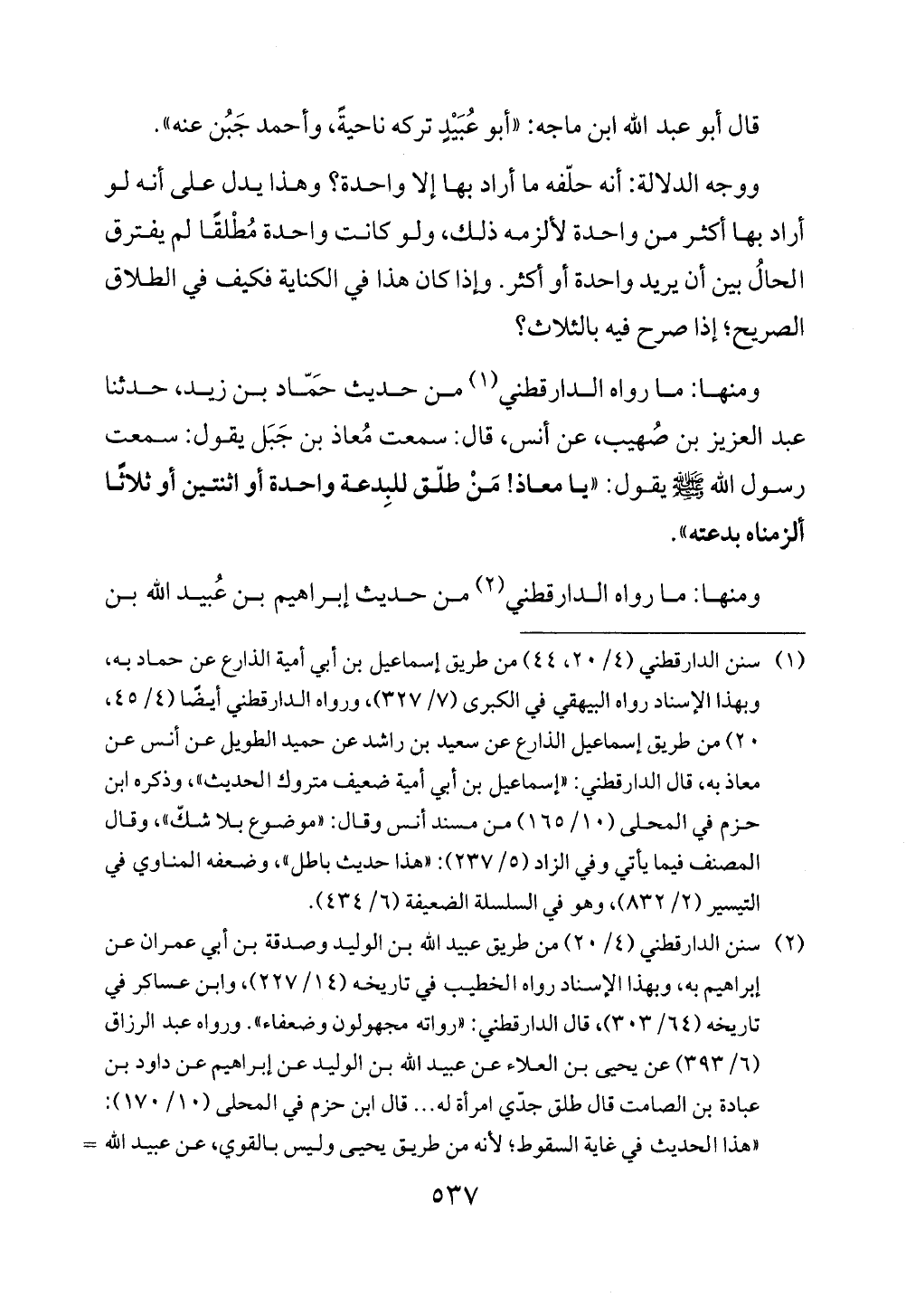 ومنها: ما رواه الدارقطني (¬1) من حديث حَمّاد بن زيد، حدثنا عبد العزيز بن صُهيب، عن أنس، قال: سمعت مُعاذ بن جَبَل يقول: سمعت رسول الله - صلى الله عليه وسلم - يقول: "يا معاذ! مَنْ طلّق للبِدعة واحدة أو اثنتين أو ثلاثًا ألزمناه بدعته".