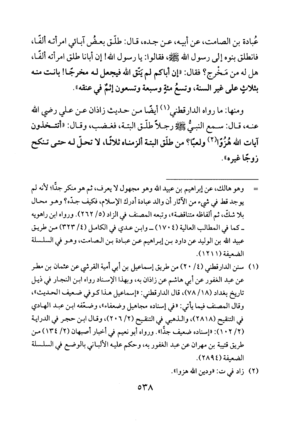 ومنها: ما رواه الدارقطني (¬1) أيضًا من حديث زاذان عن علي رضي الله عنه، قال: سمع النبيُّ - صلى الله عليه وسلم - رجلاً طلّق البتة، فغضب، وقال: "أتتخذون آيات الله هُزُوًا (¬2) ولعبًا؟ من طلّق البتة ألزمناه ثلاًثا، لا تحلّ له حتى تنكح زوجًا غيره".