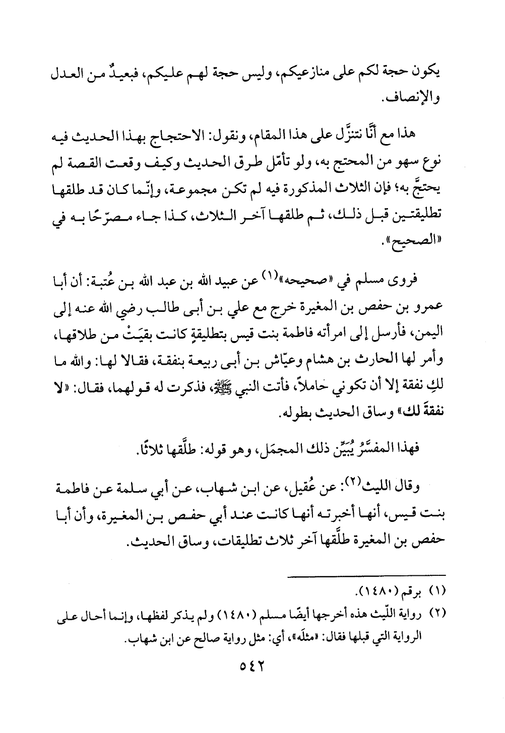 فروى مسلم في "صحيحه" (¬1) عن عبيد الله بن عبد الله بن عُتبة: أن أبا عمرو بن حفص بن المغيرة خرج مع علي بن أبى طالب رضي الله عنه إلى اليمن، فأرسل إلى امرأته فاطمة بنت قيس بتطليقةٍ كانت بقيَتْ من طلاقها، وأمر لها الحارث بن هشام وعيّاش بن أبى ربيعة بنفقة، فقالا لها: والله ما لكِ نفقة إلا أن تكوني حاملاً، فأتت النبي - صلى الله عليه وسلم -، فذكرت له قولهما، فقال: "لا نفقةَ لك" وساق الحديث بطوله.