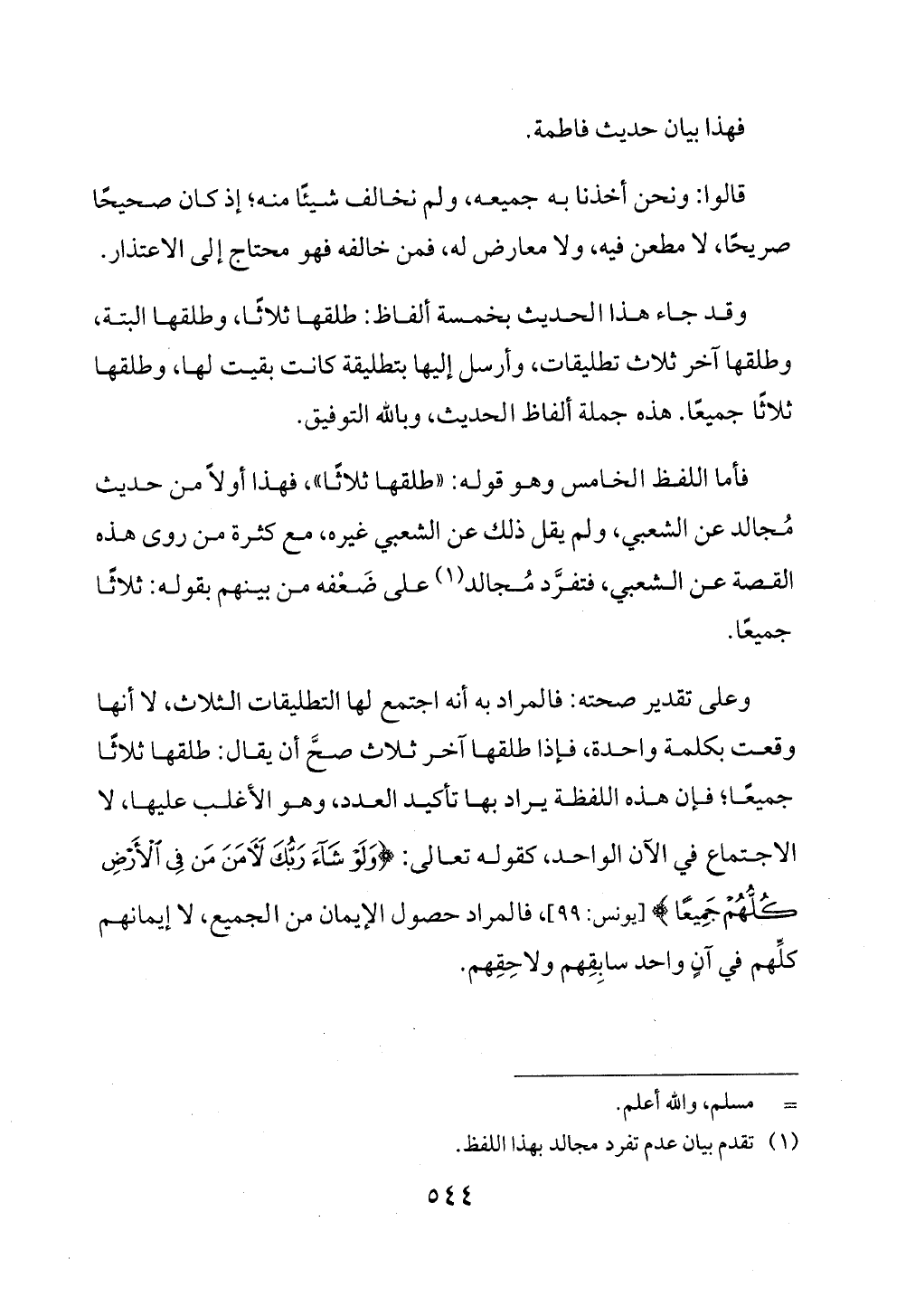 وعلى تقدير صحته: فالمراد به أنه اجتمع لها التطليقات الثلاث، لا أنها وقعت بكلمة واحدة، فإذا طلقها آخر ثلاث صحَّ أن يقال: طلقها ثلاثًا جميعًا؛ فإن هذه اللفظة يراد بها تأكيد العدد، وهو الأغلب عليها، لا الاجتماع في الآن الواحد، كقوله تعالى: {وَلَوْ شَاءَ رَبُّكَ لَآمَنَ مَنْ فِي الْأَرْضِ كُلُّهُمْ جَمِيعًا} [يونس: 99]، فالمراد حصول الإيمان من الجميع، لا إيمانهم كلِّهم في آنٍ واحد سابِقِهم ولاحِقِهم.