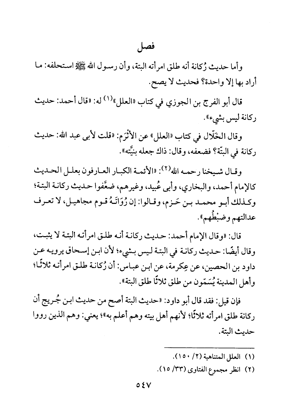 وقال شيخنا رحمه الله (¬2): "الأئمة الكبار العارفون بعلل الحديث كالإمام أحمد، والبخاري، وأبى عُبيد، وغيرهم، ضعَّفوا حديث ركانة البتة؛ وكذلك أبو محمد بن حَزم، وقالوا: إن رُوَاتَهُ قوم مجاهيل، لا تعرف عدالتهم وضبْطُهم".