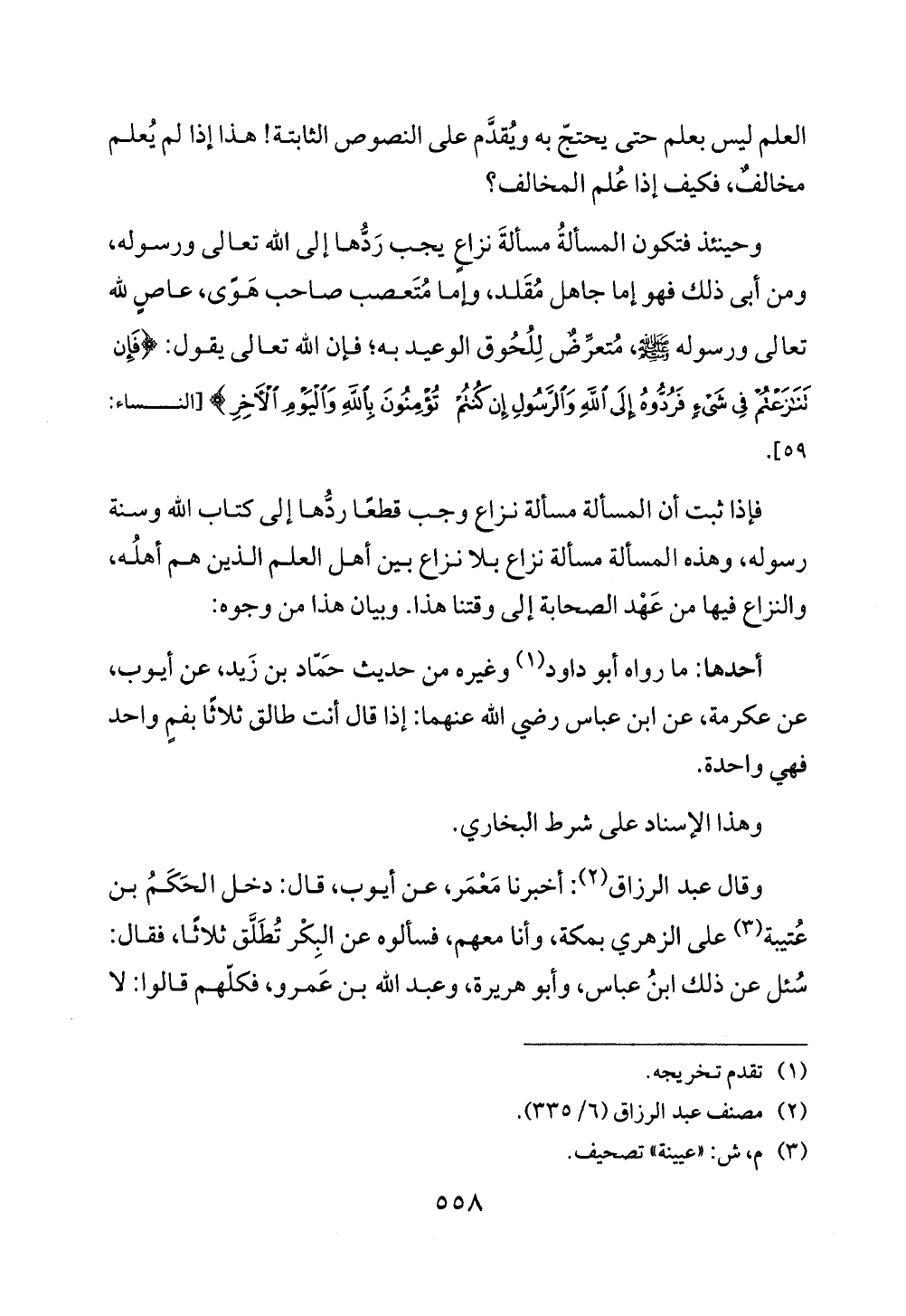 وحينئذ فتكون المسألةُ مسألةَ نزاعٍ يجب رَدُّها إلى الله تعا لى ورسوله، ومن أبى ذلك فهو إما جاهل مُقَلد، وإما مُتَعصب صاحب هَوًى، عاصٍ لله تعا لى ورسوله - صلى الله عليه وسلم -، مُتعرِّضٌ لِلُحُوق الوعيد به؛ فإن الله تعالى يقول: {فَإِنْ تَنَازَعْتُمْ فِي شَيْءٍ فَرُدُّوهُ إِلَى اللَّهِ وَالرَّسُولِ إِنْ كُنْتُمْ تُؤْمِنُونَ بِاللَّهِ وَالْيَوْمِ الْآخِرِ} [النساء: 59].