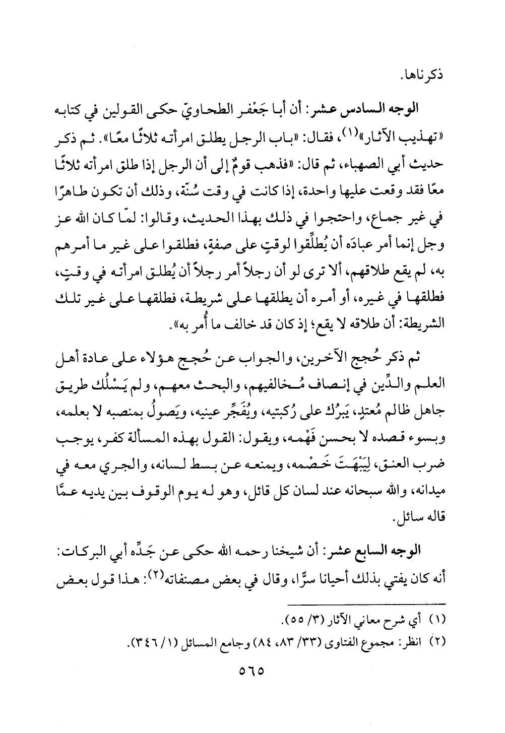 الوجه السادس عشر: أن أبا جَعْفر الطحاويّ حكى القولين في كتابه "تهذيب الآثار" (¬1)، فقال: "باب الرجل يطلق امرأته ثلاثًا معًا". ثم ذكر حديث أبي الصهباء، ثم قال: "فذهب قومٌ إلى أن الرجل إذا طلق امرأته ثلاثًا معًا فقد وقعت عليها واحدة، إذا كانت في وقت سُنّة، وذلك أن تكون طاهرًا في غير جماع، واحتجوا في ذلك بهذا الحديث، وقالوا: لمّا كان الله عز وجل إنما أمر عبادَه أن يُطلِّقوا لوقت على صفةٍ، فطلقوا على غير ما أمرهم به، لم يقع طلاقهم، ألا ترى لو أن رجلاً أمر رجلاً أن يُطلق امرأته في وقتٍ، فطلقها في غيره، أو أمره أن يطلقها على شريطة، فطلقها على غير تلك الشريطة: أن طلاقه لا يقع؛ إذ كان قد خالف ما أُمر به".