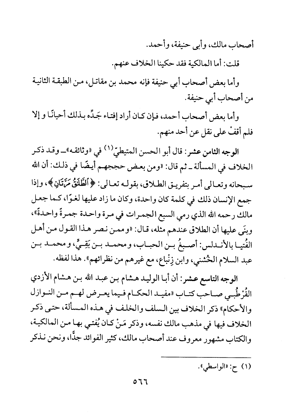 الوجه التاسع عشر: أن أبا الوليد هشام بن عبد الله بن هشام الأزدي القُرْطُبي صاحب كتاب "مفيد الحكام فيما يعرض لهم من النوازل والأحكام" ذكر الخلاف بين السلف والخلف في هذه المسألة، حتى ذكر الخلاف فيها في مذهب مالك نفسه، وذكر مَنْ كان يُفتي بها من المالكية، والكتاب مشهور معروف عند أصحاب مالك، كثير الفوائد جدًّا، ونحن نذكر