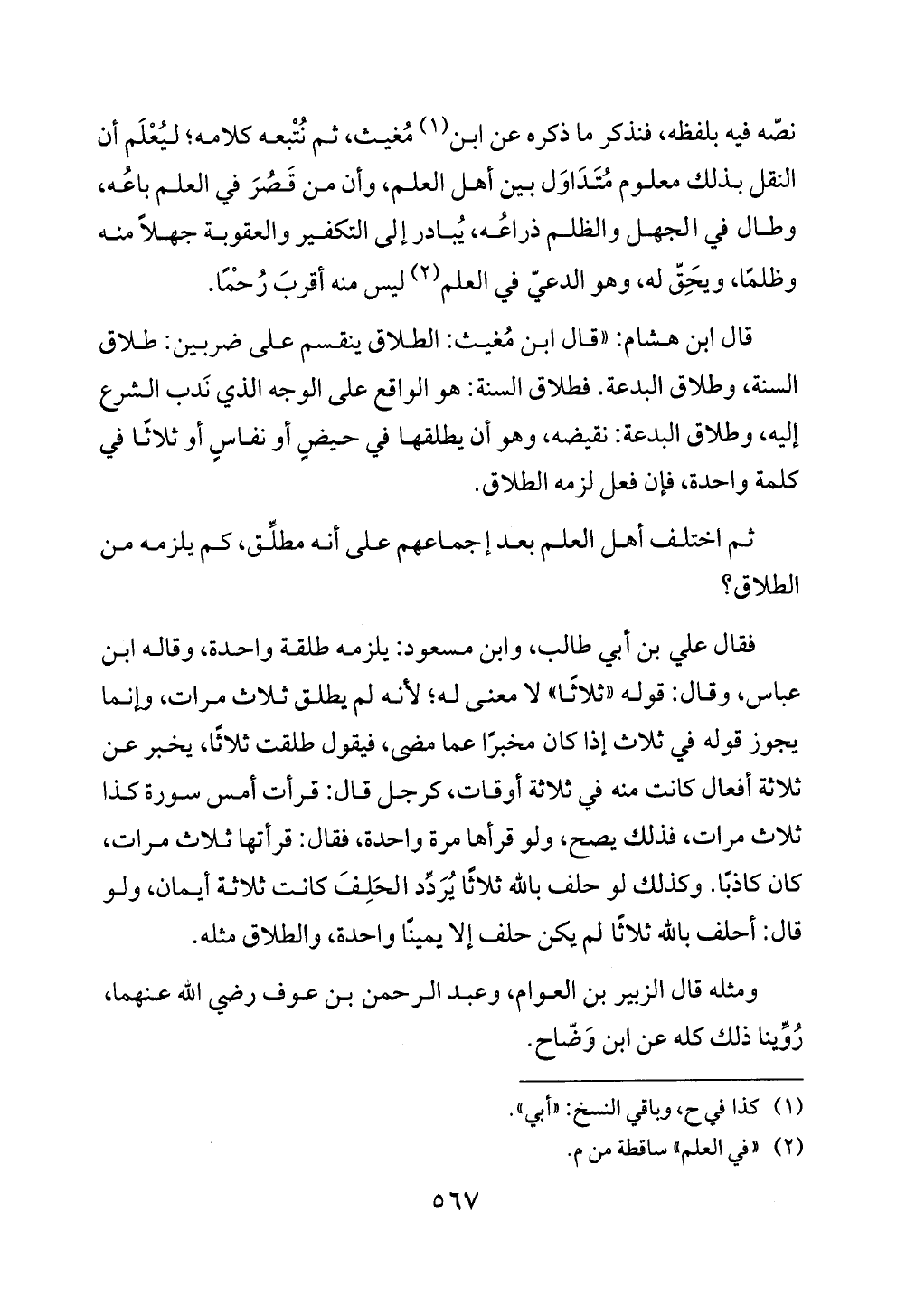 قال ابن هشام: "قال ابن مُغيث: الطلاق ينقسم على ضربين: طلاق السنة، وطلاق البدعة. فطلاق السنة: هو الواقع على الوجه الذي نَدب الشرع إليه، وطلاق البدعة: نقيضه، وهو أن يطلقها في حيضٍ أو نفاسٍ أو ثلاثًا في كلمة واحدة، فإن فعل لزمه الطلاق.