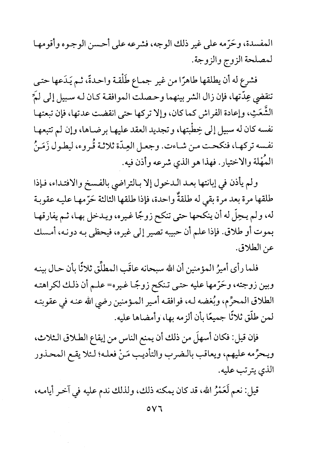 فلما رأى أميرُ المؤمنين أن الله سبحانه عاقَب المطلِّق ثلاثًا بأن حال بينه وبين زوجته، وحَرّمها عليه حتى تنكح زوجًا غيره = علم أن ذلك لكراهته الطلاق المحرِّم، وبُغضه له، فوافقه أمير المؤمنين رضي الله عنه في عقوبته لمن طلّق ثلاثًا جميعًا بأن ألزمه بها، وأمضاها عليه.