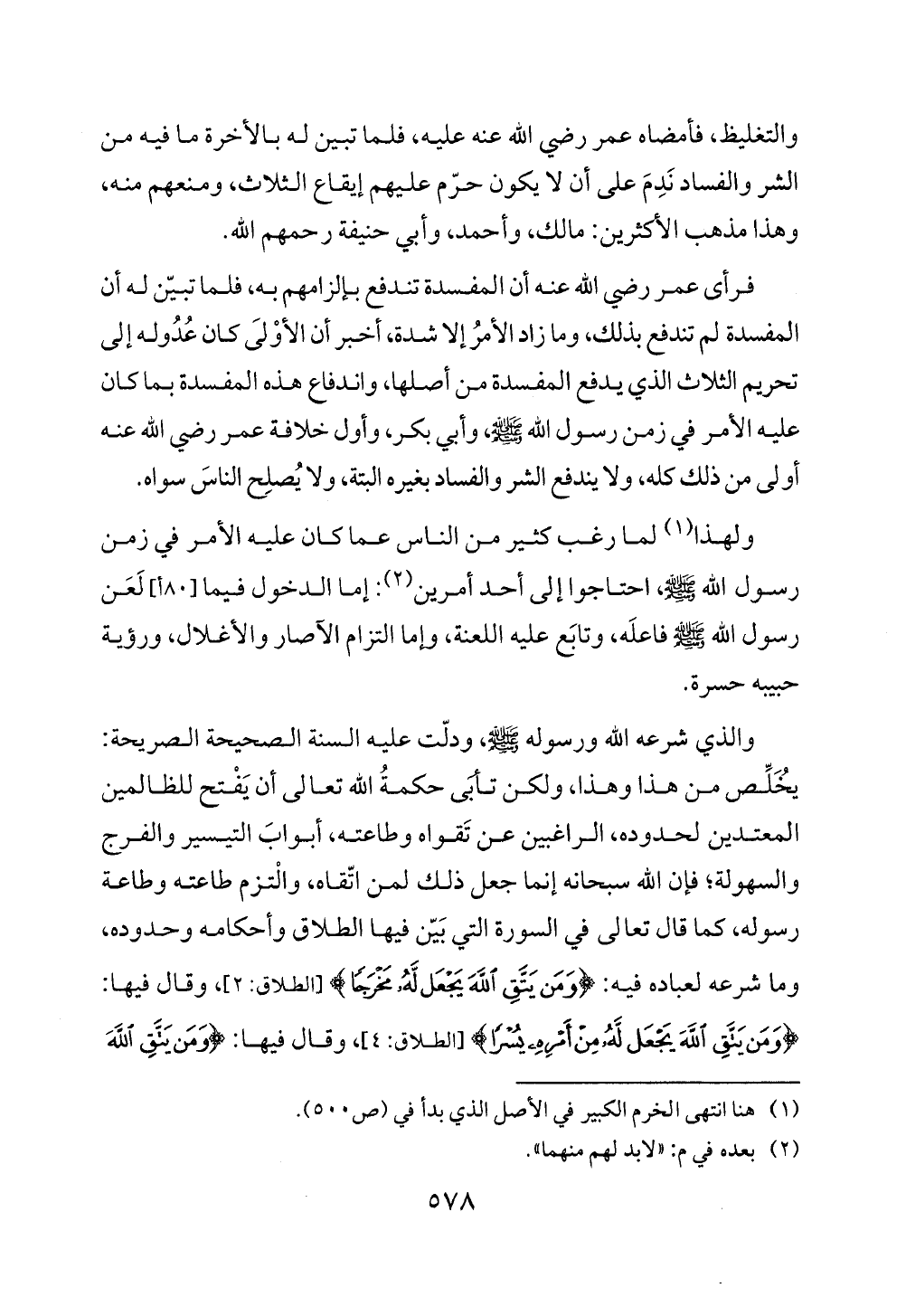 فرأى عمر رضي الله عنه أن المفسدة تندفع بإلزامهم به، فلما تبيّن له أن المفسدة لم تندفع بذلك، وما زاد الأمرُ إلا شدة، أخبر أن الأوْلىَ كان عُدُوله إلى تحريم الثلاث الذي يدفع المفسدة من أصلها، واندفاع هذه المفسدة بما كان عليه الأمر في زمن رسول الله - صلى الله عليه وسلم -، وأبي بكر، وأول خلافة عمر رضي الله عنه أولى من ذلك كله، ولا يندفع الشر والفساد بغيره البتة، ولا يُصلِح الناسَ سواه.