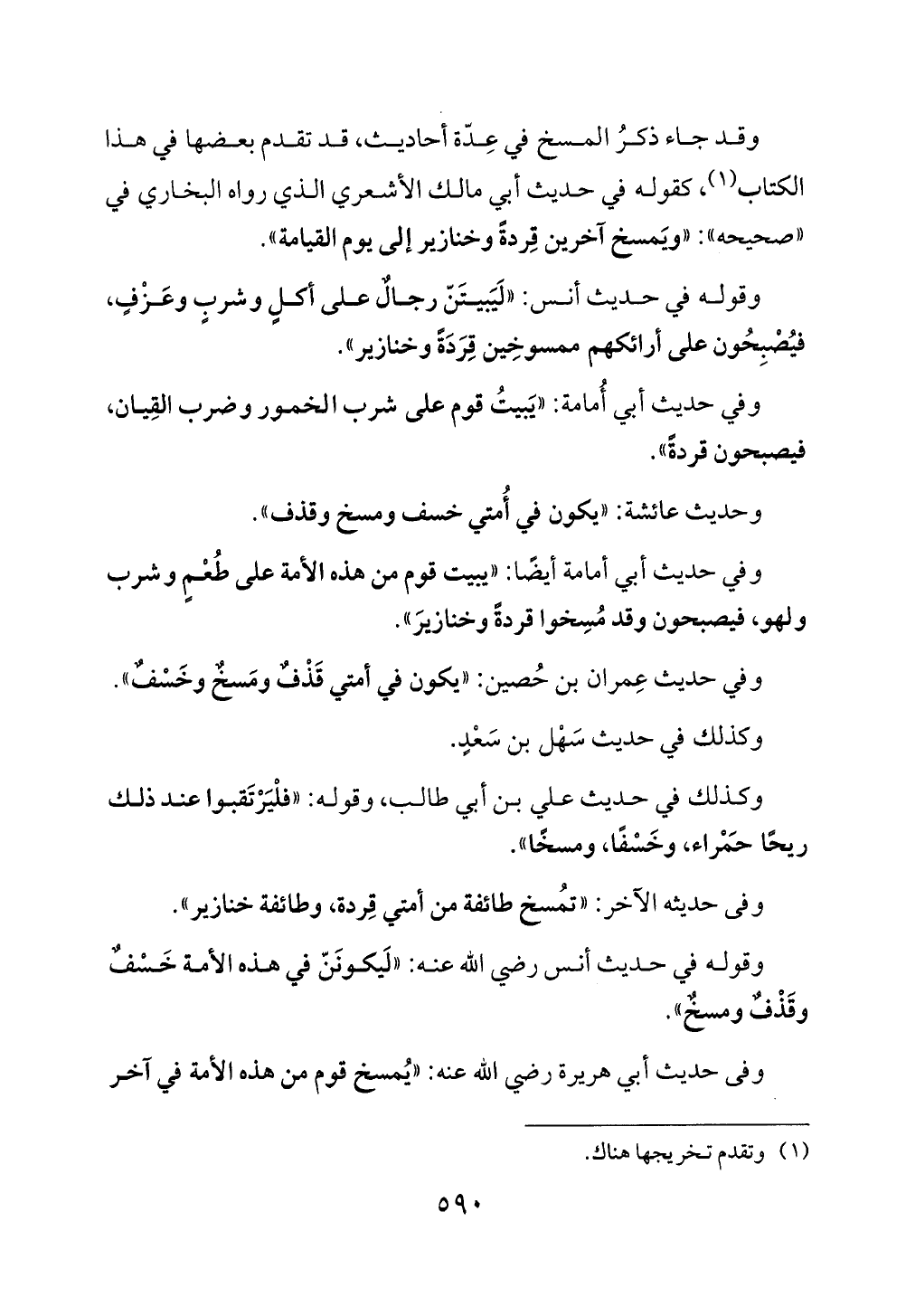وقد جاء ذكرُ المسخ في عِدّة أحاديث، قد تقدم بعضها في هذا الكتاب (¬1)، كقوله في حديث أبي مالك الأشعري الذي رواه البخاري في "صحيحه": "ويَمسخ آخرين قِردة وخنازير إلى يوم القيامة".
