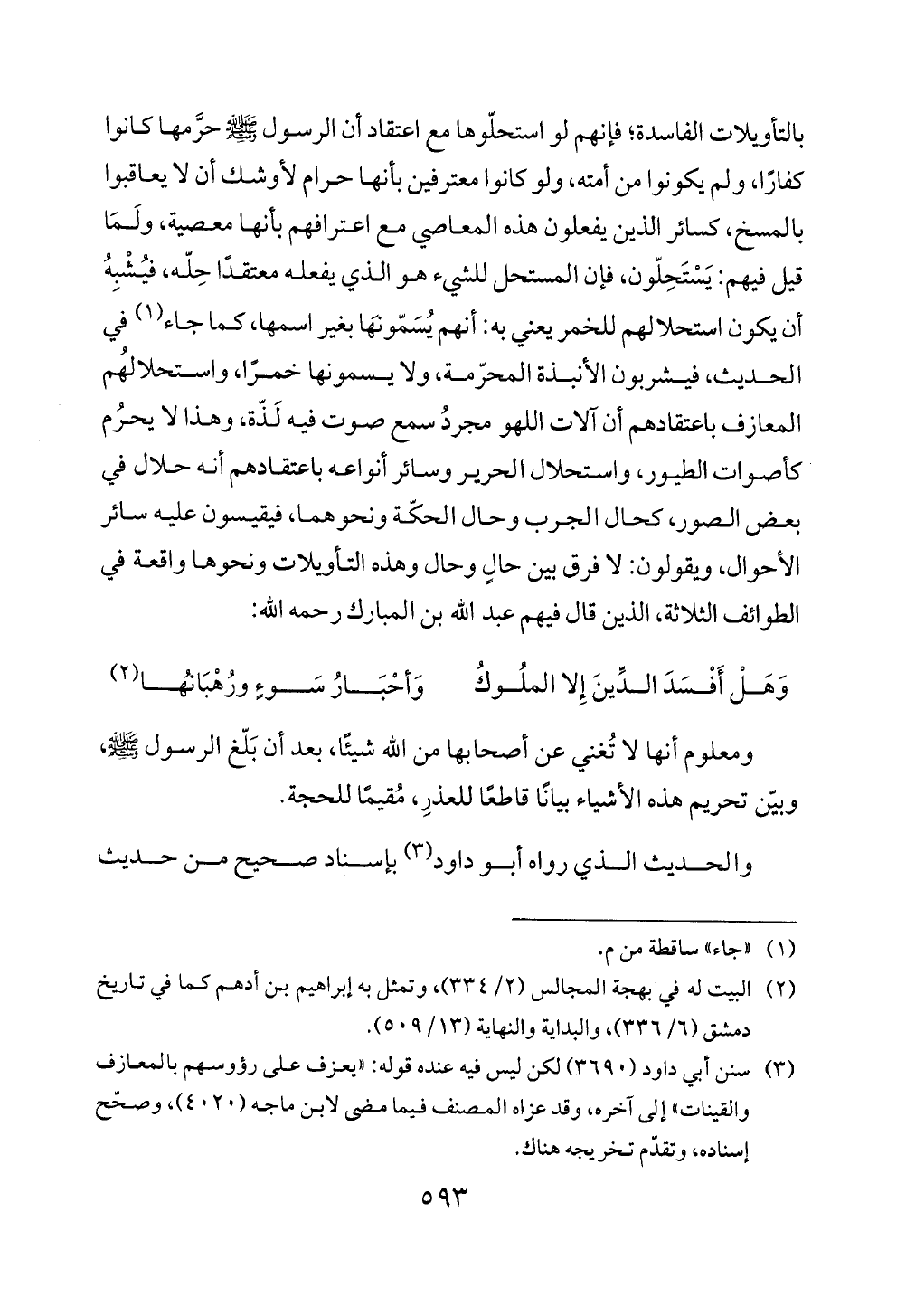 بالتأويلات الفاسدة؛ فإنهم لو استحلّوها مع اعتقاد أن الرسول - صلى الله عليه وسلم - حرَّمها كانوا كفارًا، ولم يكونوا من أمته، ولو كانوا معترفين بأنها حرام لأوشك أن لا يعاقبوا بالمسخ، كسائر الذين يفعلون هذه المعاصي مع اعترافهم بأنها معصية، ولَمَا قيل فيهم: يَسْتَحِلّون، فإن المستحل للشيء هو الذي يفعله معتقدًا حِلّه، فيُشْبِهُ أن يكون استحلالهم للخمر يعني به: أنهم يُسَمّونهَا بغير اسمها، كما جاء (¬1) في الحديث، فيشربون الأنبذة المحرّمة، ولا يسمونها خمرًا، واستحلالهُم المعازف باعتقادهم أن آلات اللهو مجردُ سمع صوت فيه لَذّة، وهذا لا يحرُم كأصوات الطيور، واستحلال الحرير وسائر أنواعه باعتقادهم أنه حلال في بعض الصور، كحال الجرب وحال الحكّة ونحوهما، فيقيسون عليه سائر الأحوال، ويقولون: لا فرق بين حالٍ وحال وهذه التأويلات ونحوها واقعة في الطوائف الثلاثة، الذين قال فيهم عبد الله بن المبارك رحمه الله: