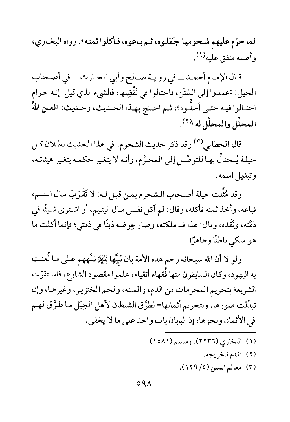 قال الإمام أحمد -في رواية صالح وأبي الحارث- في أصحاب الحيل: "عمدوا إلي السّنَن، فاحتالوا في نَقْضِها، فالشيء الذي قيل: إنه حرام احتالوا فيه حتي أحلُّوه"، ثم احتج بهذا الحديث، وحديث: "لعن اللهُ المحلِّل والمحلَّل له" (¬2).