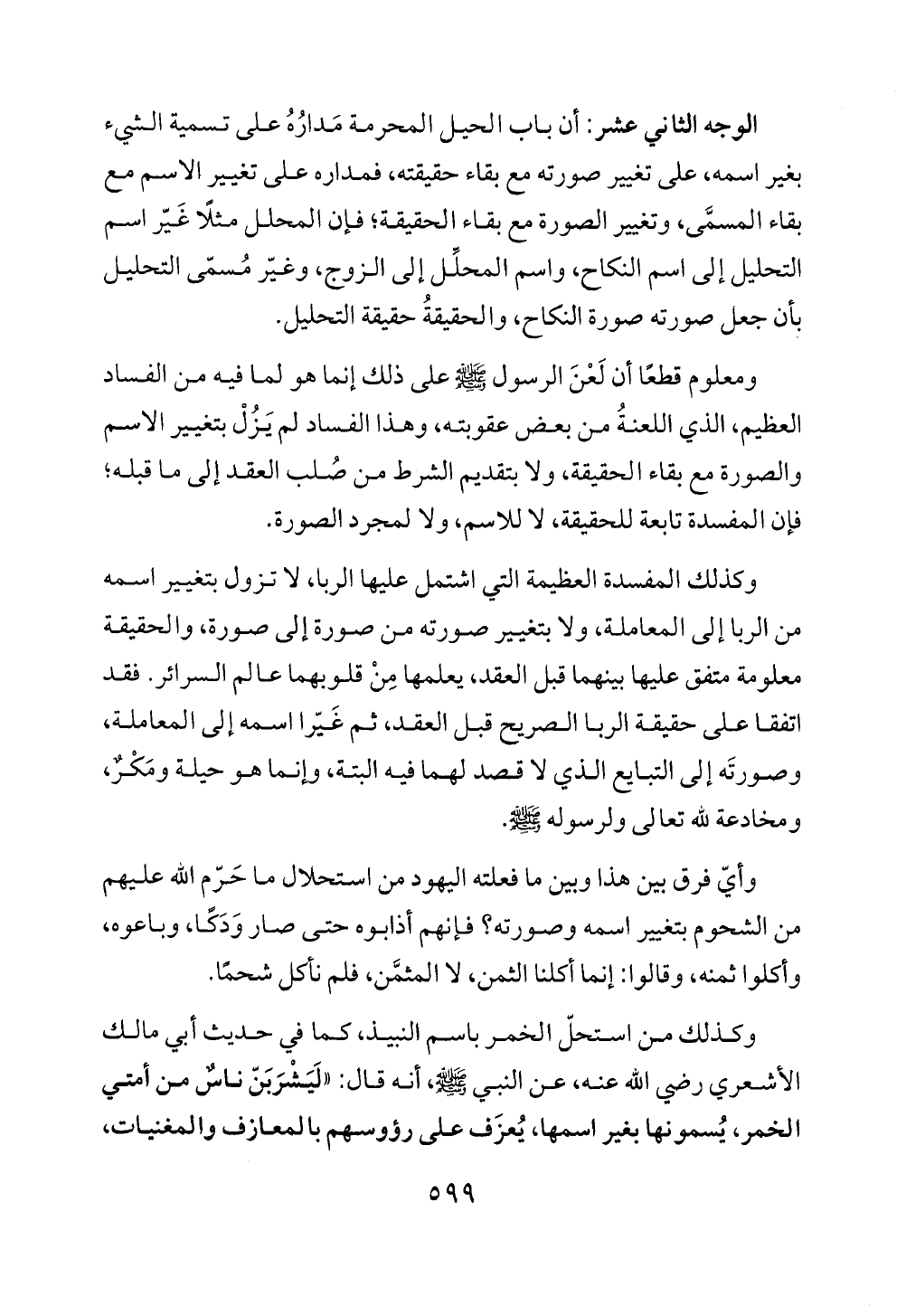 الوجه الثاني عشر: أن باب الحيل المحرمة مَدارُهُ على تسمية الشيء بغير اسمه، على تغيير صورته مع بقاء حقيقته، فمداره على تغيير الاسم مع بقاء المسمَّى، وتغيير الصورة مع بقاء الحقيقة؛ فإن المحلل مثلًا غَيّر اسم التحليل إلى اسم النكاح، واسم المحلِّل إلى الزوج، وغيّر مُسمّى التحليل بأن جعل صورته صورة النكاح، والحقيقةُ حقيقة التحليل.
