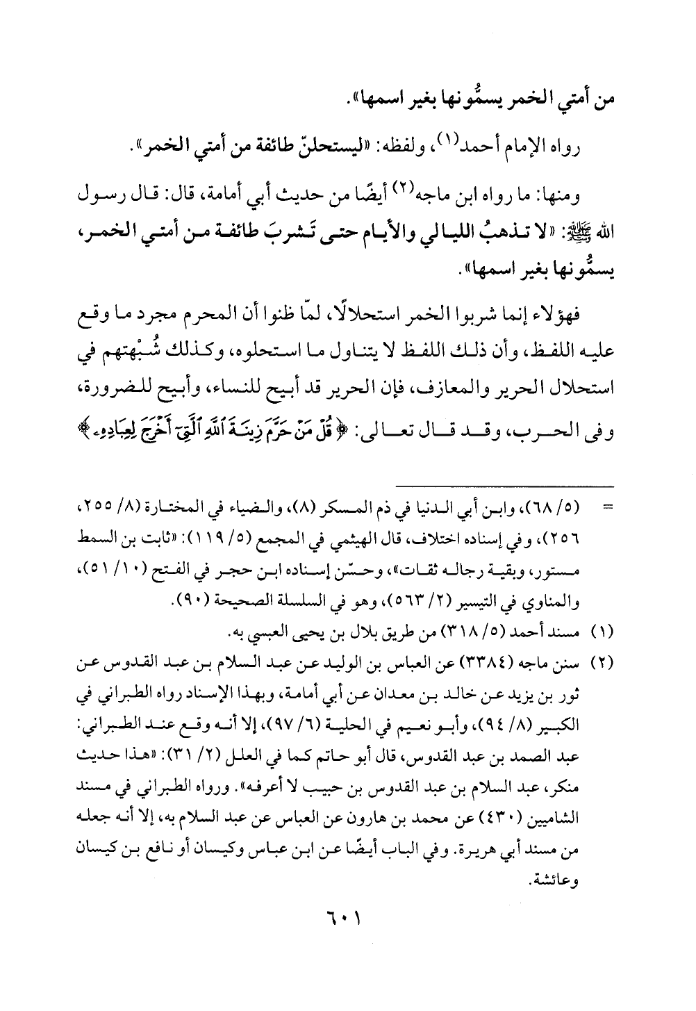 فهؤلاء إنما شربوا الخمر استحلالًا، لمّا ظنوا أن المحرم مجرد ما وقع عليه اللفظ، وأن ذلك اللفظ لا يتناول ما استحلوه، وكذلك شُبْهتهم في استحلال الحرير والمعازف، فإن الحرير قد أبيح للنساء، وأبيح للضرورة، وفى الحرب، وقد قال تعالى: {قُلْ مَنْ حَرَّمَ زِينَةَ اللَّهِ الَّتِي أَخْرَجَ لِعِبَادِهِ}