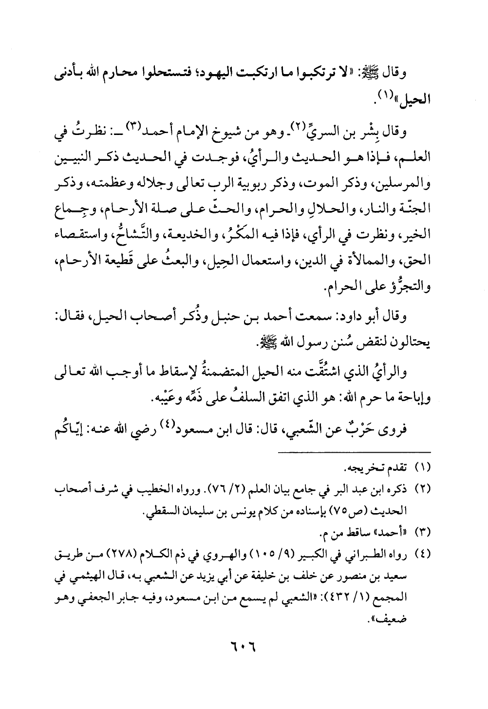 وقال بِشْر بن السريِّ (¬2) -وهو من شيوخ الإمام أحمد (¬3) -: نظرتُ في العلم، فإذا هو الحديث والرأيُ، فوجدت في الحديث ذكر النبيين والمرسلين، وذكر الموت، وذكر ربوبية الرب تعالى وجلاله وعظمته، وذكر الجنّة والنار، والحلالِ والحرام، والحثّ على صلة الأرحام، وجِماع الخير، ونظرت في الرأي، فإذا فيه المَكْرُ، والخديعة، والتَّشاحُّ، واستقصاء الحق، والممالأة في الدين، واستعمال الحِيل، والبعثُ على قَطيعة الأرحام، والتجرُّؤ على الحرام.
