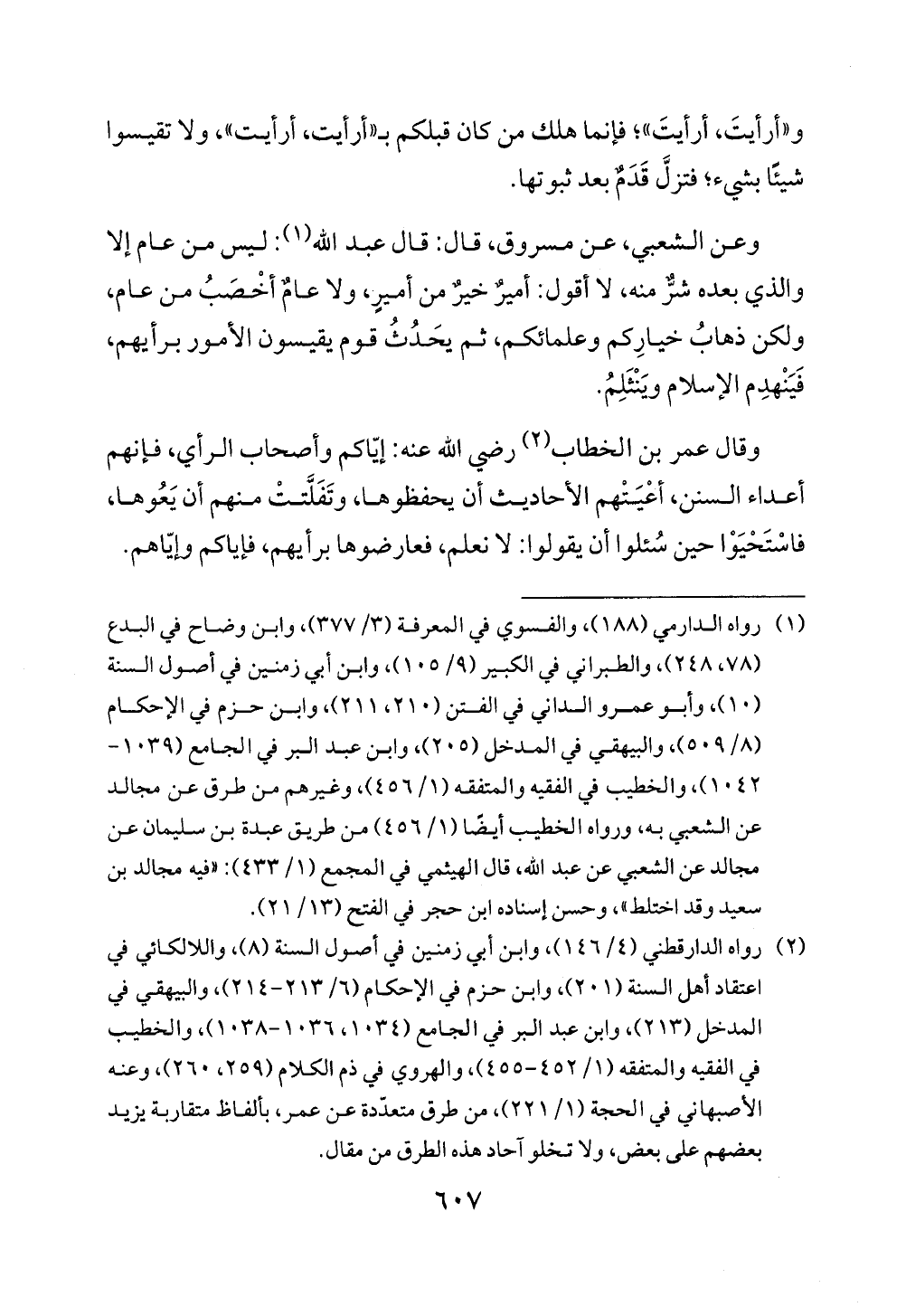 (¬2) رواه الدارقطني (4/ 146)، وابن أبي زمنين في أصول السنة (8)، واللالكائي في اعتقاد أهل السنة (201)، وابن حزم في الإحكام (6/ 213 - 214)، والبيهقي في المدخل (213)، وابن عبد البر في الجامع (1034، 1036 - 1038)، والخطيب في الفقيه والمتفقه (1/ 452 - 455)، والهروي في ذم الكلام (259، 260)، وعنه الأصبهاني في الحجة (1/ 221)، من طرق متعدّدة عن عمر، بألفاظ متقاربة يزيد بعضهم على بعض، ولا تخلو آحاد هذه الطرق من مقال.