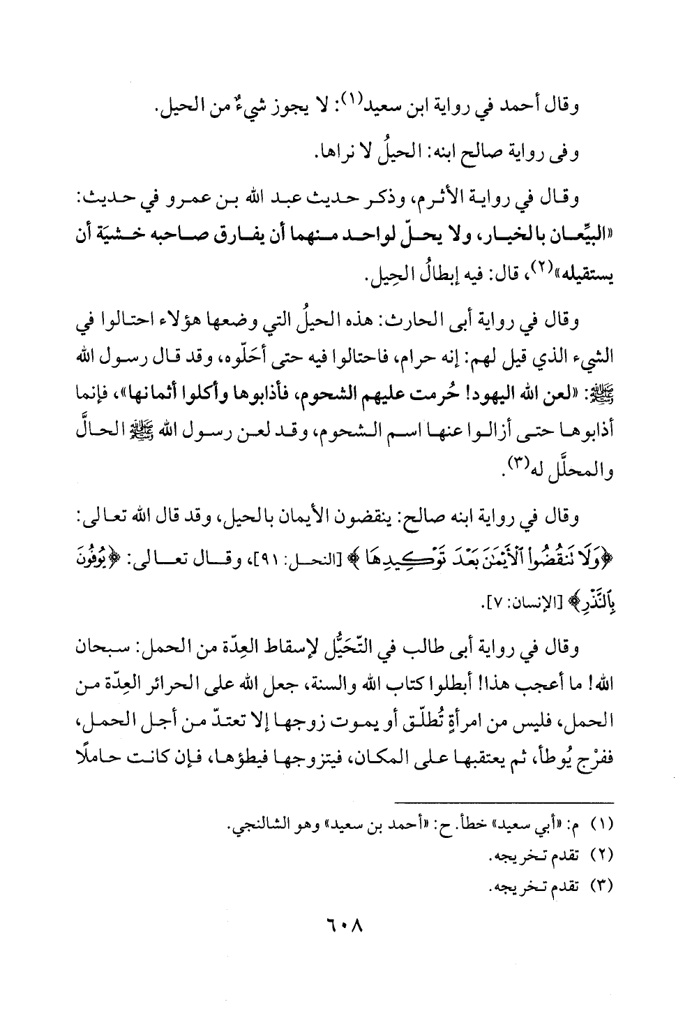 وقال في رواية ابنه صالح: ينقضون الأيمان بالحيل، وقد قال الله تعالى: {وَلَا تَنْقُضُوا الْأَيْمَانَ بَعْدَ تَوْكِيدِهَا} [النحل: 91]، وقال تعالى: {يُوفُونَ بِالنَّذْرِ} [الإنسان: 7].