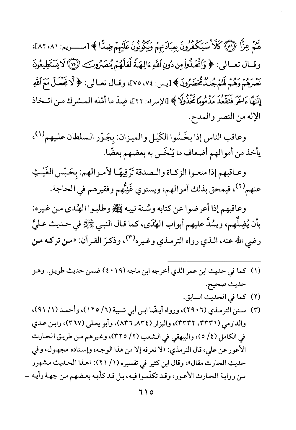 وعاقبهم إذا أعرضوا عن كتابه وسُنة نبيه - صلى الله عليه وسلم -وطلبوا الهُدى من غيره: بأن يُضِلَّهم، ويسُدَّ عليهم أبواب الهُدَى، كما قال النبي - صلى الله عليه وسلم -في حديث عليٍّ رضي الله عنه، الذي رواه الترمذي وغيره (¬3)، وذكرَ القرآن: "من تركه من