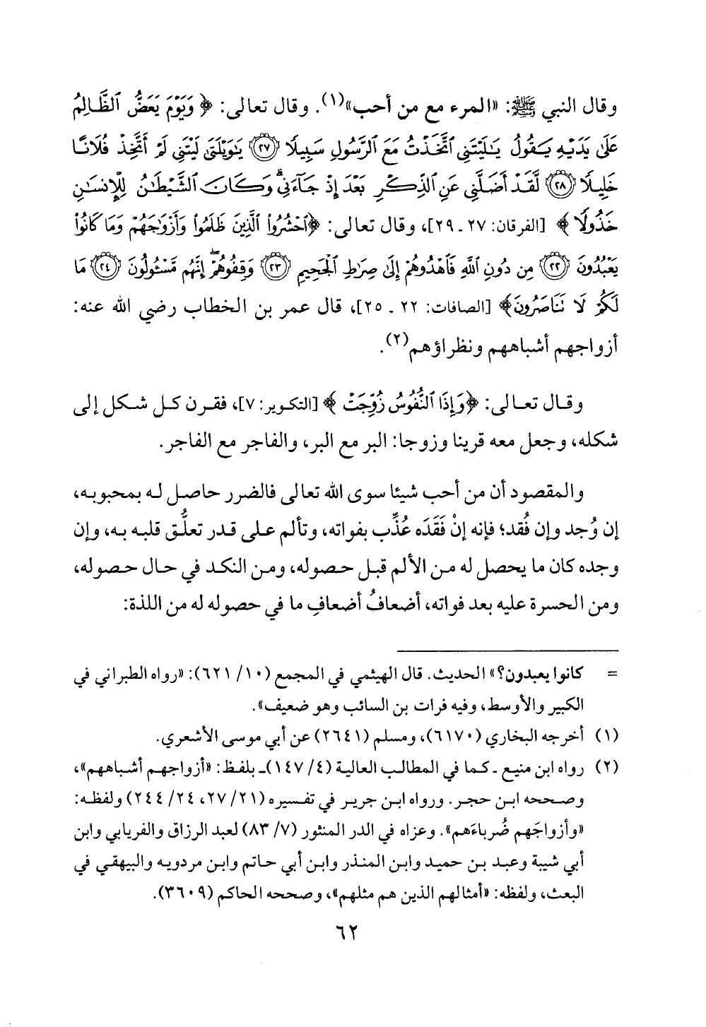 وقال النبي - صلى الله عليه وسلم -: "المرء مع من أحب" (¬1). وقال تعالى: {وَيَوْمَ يَعَضُّ الظَّالِمُ عَلَى يَدَيْهِ يَقُولُ يَالَيْتَنِي اتَّخَذْتُ مَعَ الرَّسُولِ سَبِيلًا (27) يَاوَيْلَتَى لَيْتَنِي لَمْ أَتَّخِذْ فُلَانًا خَلِيلًا (28) لَقَدْ أَضَلَّنِي عَنِ الذِّكْرِ بَعْدَ إِذْ جَاءَنِي وَكَانَ الشَّيْطَانُ لِلْإِنْسَانِ خَذُولًا} [الفرقان: 27 - 29]، وقال تعالى: {احْشُرُوا الَّذِينَ ظَلَمُوا وَأَزْوَاجَهُمْ وَمَا كَانُوا يَعْبُدُونَ (22) مِنْ دُونِ اللَّهِ فَاهْدُوهُمْ إِلَى صِرَاطِ الْجَحِيمِ (23) وَقِفُوهُمْ إِنَّهُمْ مَسْئُولُونَ (24) مَا لَكُمْ لَا تَنَاصَرُونَ} [الصافات: 22 - 25]، قال عمر بن الخطاب رضي الله عنه: أزواجهم أشباههم ونظراؤهم (¬2).