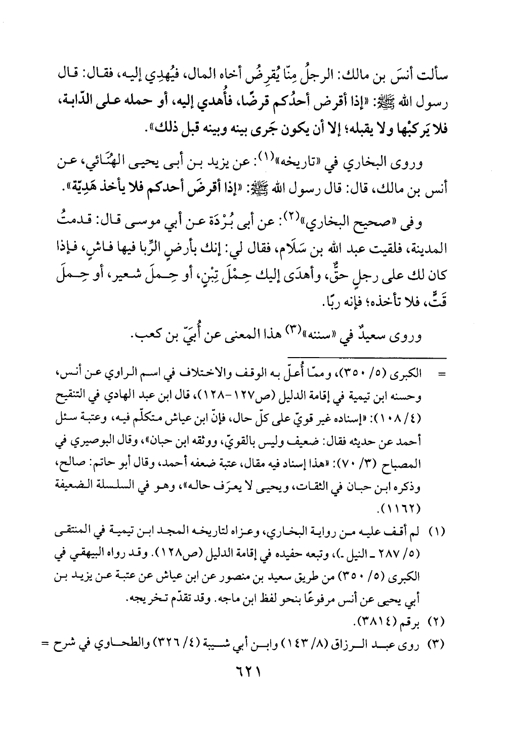 سألت أنسَ بن مالك: الرجلُ مِنّا يُقرِضُ أخاه المال، فيُهدِي إليه، فقال: قال رسول الله - صلى الله عليه وسلم -: "إذا أقرض أحدُكم قرضًا، فأُهدي إليه، أو حمله على الدّابة، فلا يَركبْها ولا يقبله؛ إلا أن يكون جَرى بينه وبينه قبل ذلك".