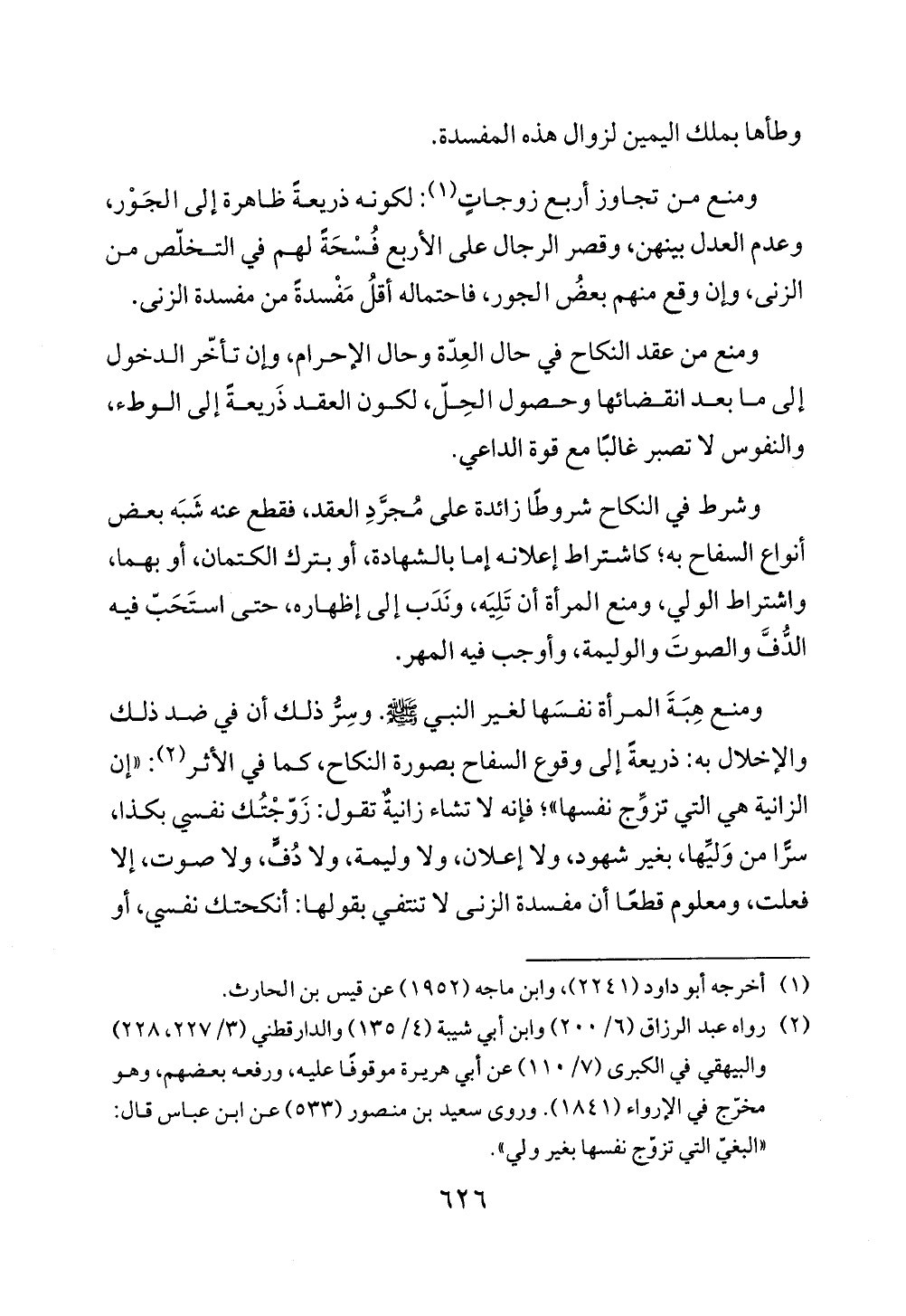 ومنع هِبَةَ المرأة نفسَها لغير النبي - صلى الله عليه وسلم -. وسِرُّ ذلك أن في ضد ذلك والإخلال به: ذريعةً إلى وقوع السفاح بصورة النكاح، كما في الأثر (¬2): "إن الزانية هي التي تزوِّج نفسها"؛ فإنه لا تشاء زانيةٌ تقول: زَوّجْتُك نفسي بكذا، سرًّا من وَليِّها، بغير شهود، ولا إعلان، ولا وليمة، ولا دُفٍّ، ولا صوت، إلا فعلت، ومعلوم قطعًا أن مفسدة الزنى لا تنتفي بقولها: أنكحتك نفسي، أو