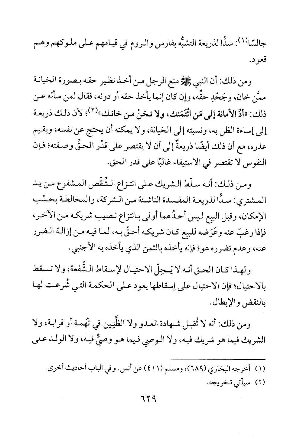 ومن ذلك: أن النبي - صلى الله عليه وسلم - منع الرجل من أخذ نظير حقه بصورة الخيانة ممَّن خان، وجَحْدِ حقِّه، وإن كان إنما يأخذ حقه أو دونه، فقال لمن سأله عن ذلك: "أدِّ الأمانة إلى مَن ائْتَمَنك، ولا تخنْ من خانك" (¬2)؛ لأن ذلك ذريعة إلى إساءة الظن به، ونسبته إلى الخيانة، ولا يمكنه أن يحتج عن نفسه، ويقيم عذره، مع أن ذلك أيضًا ذريعةٌ إلى أن لا يقتصر على قدْر الحقِّ وصفته؛ فإن النفوس لا تقتصر في الاستيفاء غالبًا على قدر الحق.