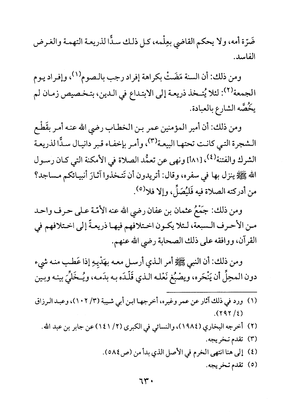 ومن ذلك: جَمْعُ عثمان بن عفان رضي الله عنه الأمّة على حرف واحد من الأحرف السبعة، لئلا يكون اختلافهم فيها ذريعةً إلى اختلافهم في القرآن، ووافقه على ذلك الصحابة رضي الله عنهم.