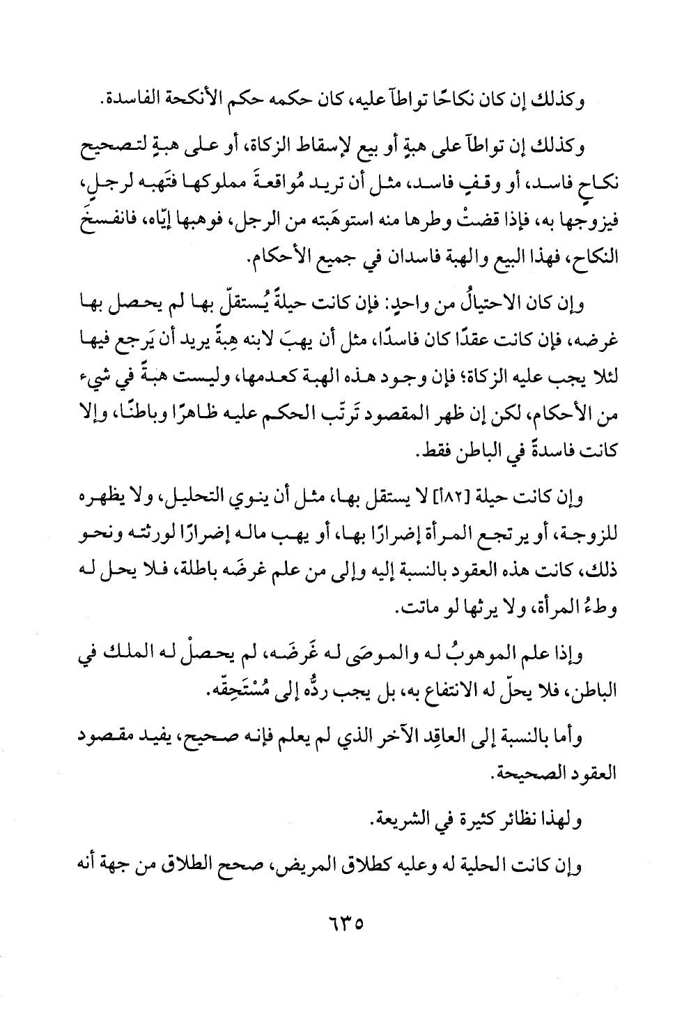 وكذلك إن تواطآ على هبةٍ أو بيع لإسقاط الزكاة، أو على هبةٍ لتصحيح نكاحٍ فاسد، أو وقفٍ فاسد، مثل أن تريد مُواقعةَ مملوكها فتَهبه لرجلٍ، فيزوجها به، فإذا قضتْ وطرها منه استوهَبته من الرجل، فوهبها إيّاه، فانفسخَ النكاح، فهذا البيع والهبة فاسدان في جميع الأحكام.