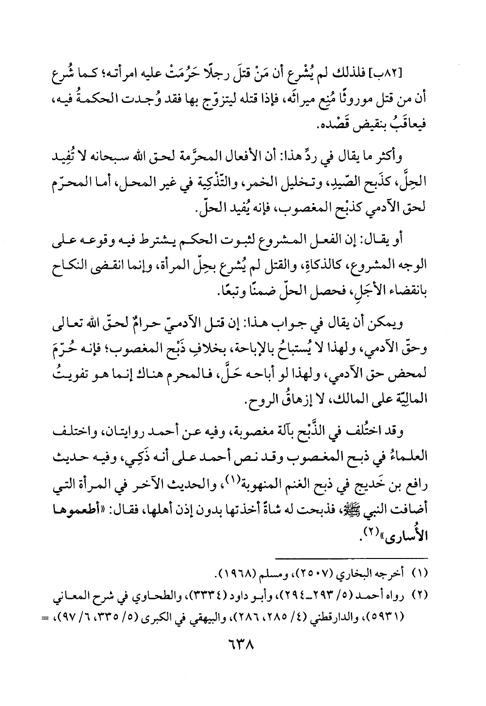 وأكثر ما يقال في ردِّ هذا: أن الأفعال المحرَّمة لحق الله سبحانه لا تُفِيد الحِلَّ، كذَبح الصّيدِ، وتخليل الخمر، والتّذْكِية في غير المحل، أما المحرّم لحق الآدمي كذبْح المغصوب، فإنه يُفيد الحلّ.