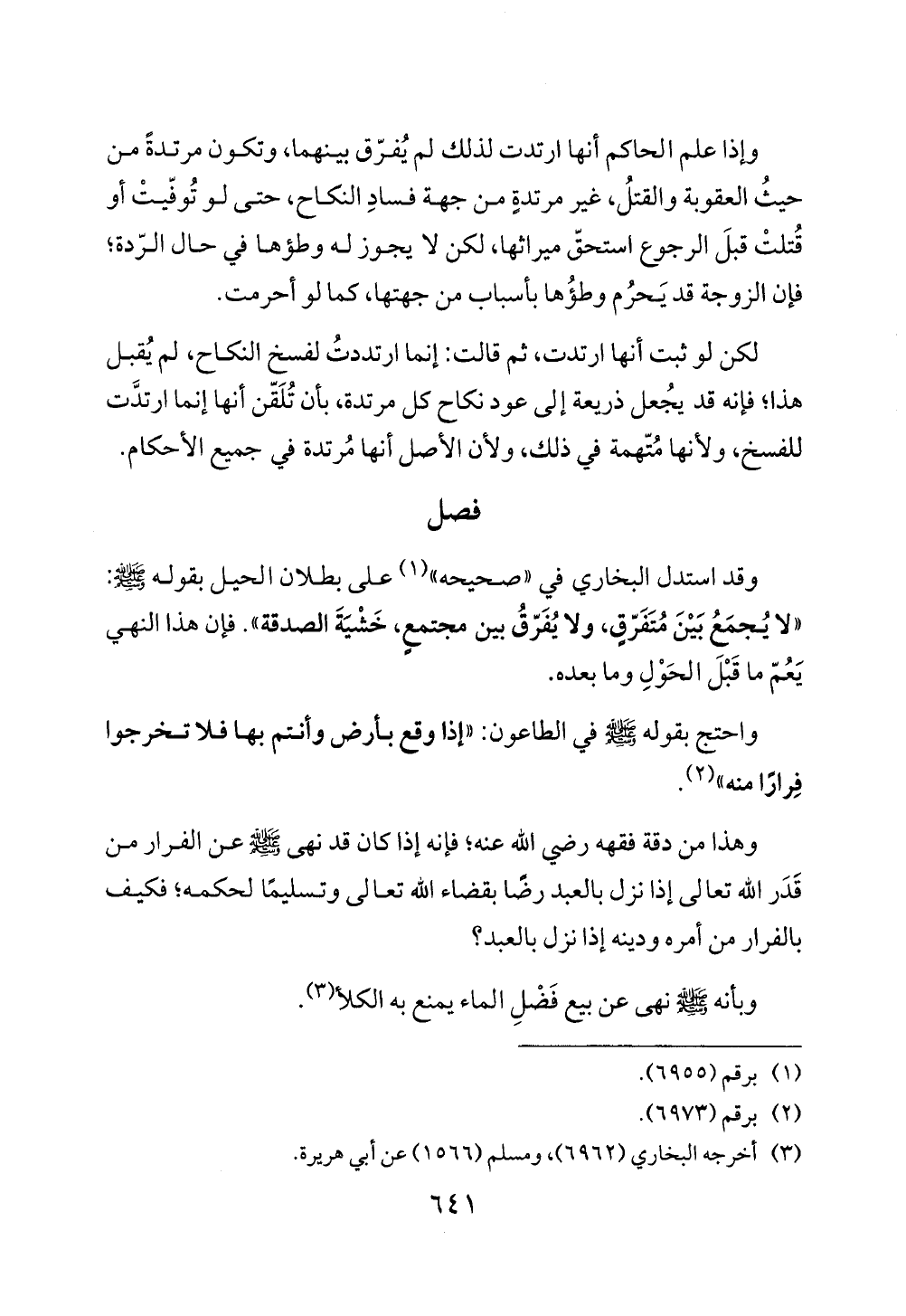 وقد استدل البخاري في "صحيحه" (¬1) على بطلان الحيل بقوله - صلى الله عليه وسلم -: "لا يُجمَعُ بَيْنَ مُتَفَرّقٍ، ولا يُفَرّقُ بين مجتمعٍ، خَشْيَةَ الصدقة". فإن هذا النهي يَعُمّ ما قَبْلَ الحَوْلِ وما بعده.