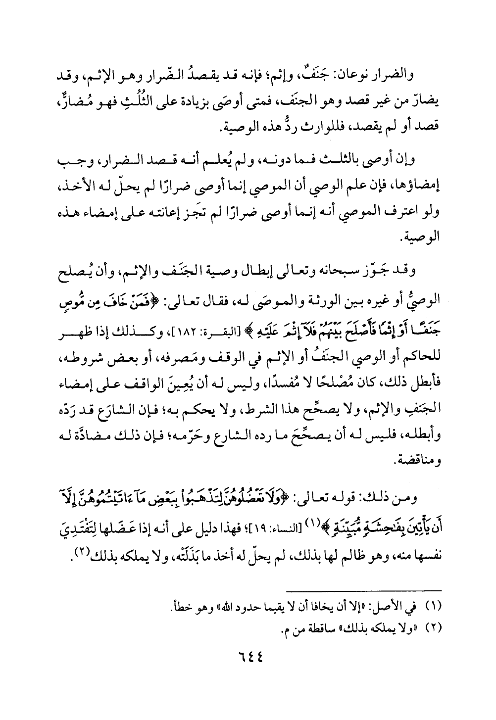 والضرار نوعان: جَنَفٌ، وإثم؛ فإنه قد يقصدُ الضّرار وهو الإثم، وقد يضارّ من غير قصد وهو الجنَف، فمتى أوصَى بزيادة على الثُلُثِ فهو مُضازٌ، قصد أو لم يقصد، فللوارث ردُّ هذه الوصية.