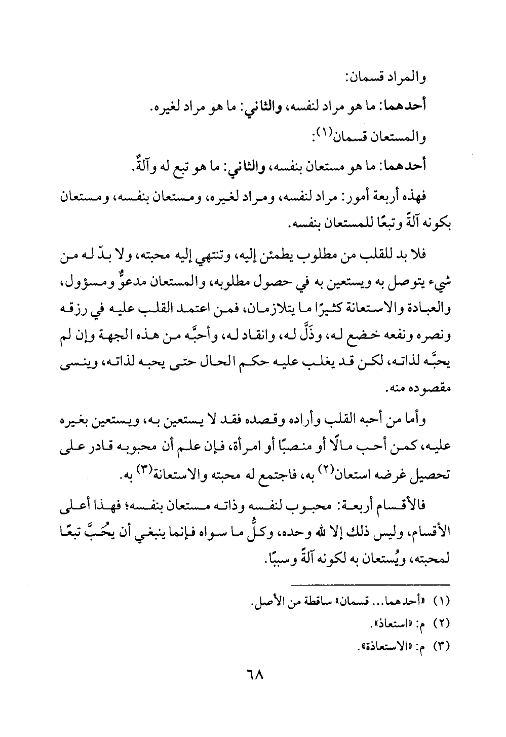 فالأقسام أربعة: محبوب لنفسه وذاته مستعان بنفسه؛ فهذا أعلى الأقسام، وليس ذلك إلا لله وحده، وكلُّ ما سواه فإنما ينبغي أن يحُبَّ تبعًا لمحبته، ويُستعان به لكونه آلةً وسببًا.