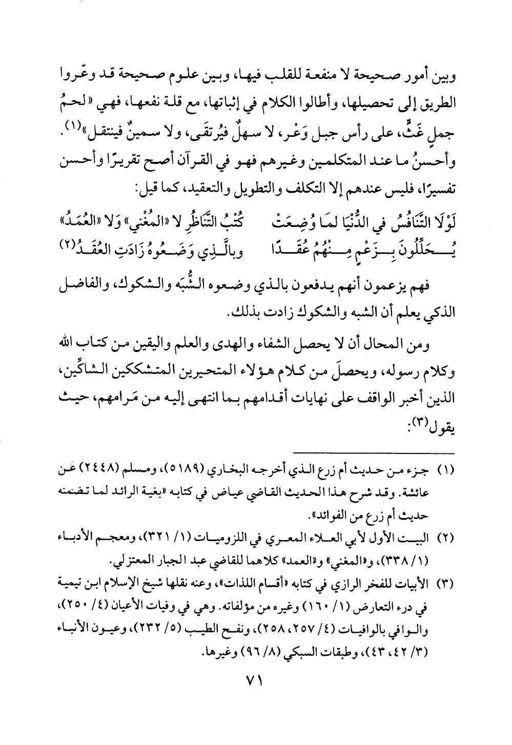 ومن المحال أن لا يحصل الشفاء والهدى والعلم واليقين من كتاب الله وكلام رسوله، ويحصلَ من كلام هؤلاء المتحيرين المتشككين الشاكِّين، الذين أخبر الواقف على نهايات أقدامهم بما انتهى إليه من مَرامهم، حيث يقول (¬3):
