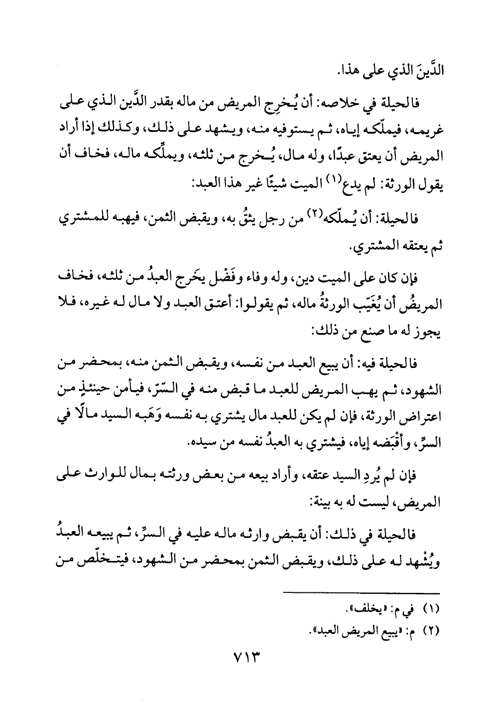 فالحيلة في خلاصه: أن يُخرِج المريض من ماله بقدر الدَّين الذي على غريمه، فيملّكه إياه، ثم يستوفيه منه، ويشهد على ذلك، وكذلك إذا أراد المريض أن يعتق عبدًا، وله مال، يُخرج من ثلثه، ويملِّكه ماله، فخاف أن يقول الورثة: لم يدع (¬1) الميت شيئًا غير هذا العبد: