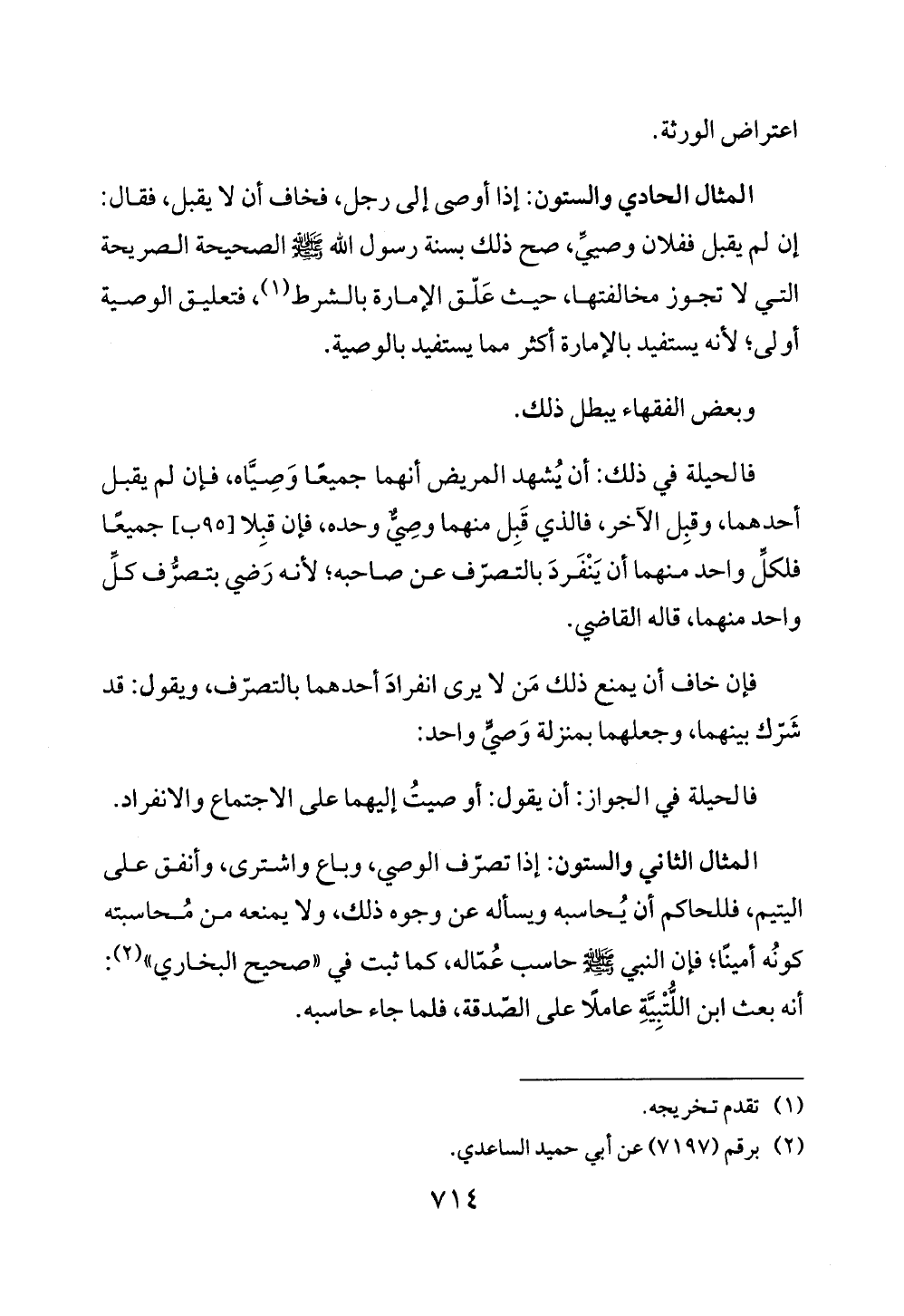 المثال الحادي والستون: إذا أوصى إلى رجل، فخاف أن لا يقبل، فقال: إن لم يقبل ففلان وصيي، صح ذلك بسنة رسول الله - صلى الله عليه وسلم - الصحيحة الصريحة التي لا تجوز مخالفتها، حيث عَلّق الإمارة بالشرط (¬1)، فتعليق الوصية أولى، لأنه يستفيد بالإمارة أكثر مما يستفيد بالوصية.