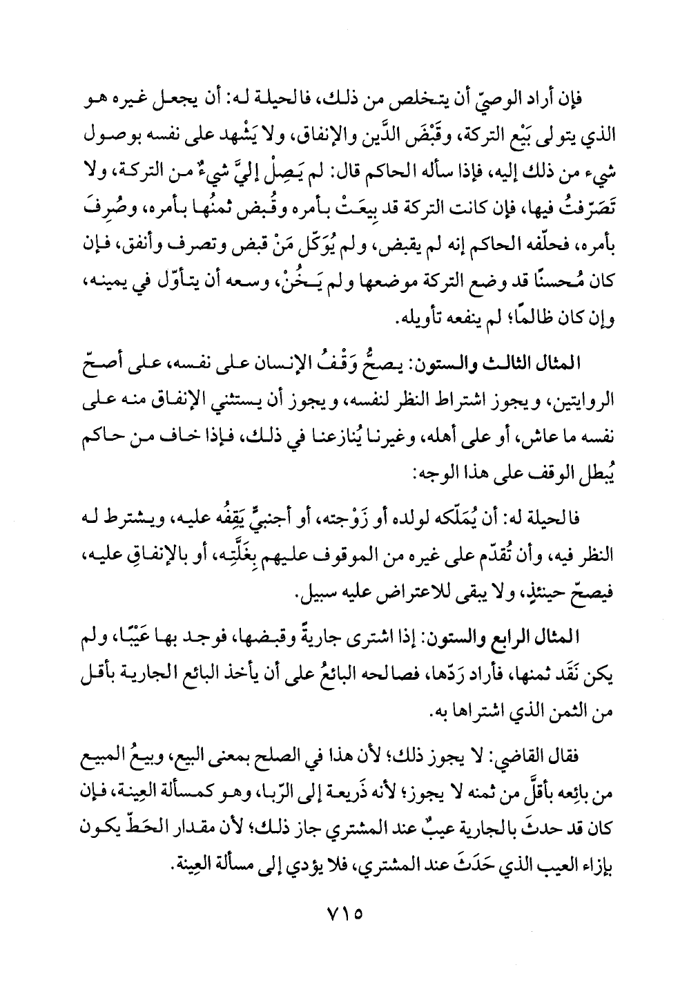 فإن أراد الوصي أن يتخلص من ذلك، فالحيلة له: أن يجعل غيره هو الذي يتولى بَيْع التركة، وقَبْضَ الدين والإنفاق، ولا يَشْهد على نفسه بوصول شيء من ذلك إليه، فإذا سأله الحاكم قال: لم يَصِلْ إليَّ شيءٌ من التركة، ولا تَصَرّفتُ فيها، فإن كانت التركة قد بِيعَتْ بأمره وقُبض ثمنُها بأمره، وصُرِفَ بأمره، فحلّفه الحاكم إنه لم يقبض، ولم يُوَكّل مَنْ قبض وتصرف وأنفق، فإن كان مُحسنًا قد وضع التركة موضعها ولم يَخُنْ، وسعه أن يتأوّل في يمينه، وإن كان ظالمًا؛ لم ينفعه تأويله.