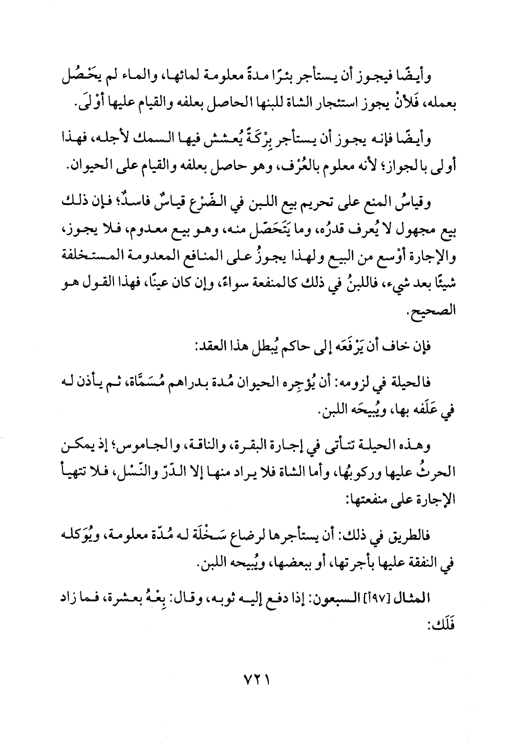 فالحيلة في لزومه: أن يُؤجِره الحيوان مُدة بدراهم مُسَمَّاة، ثم يأذن له في عَلَفه بها، ويُبيحَه اللبن.
