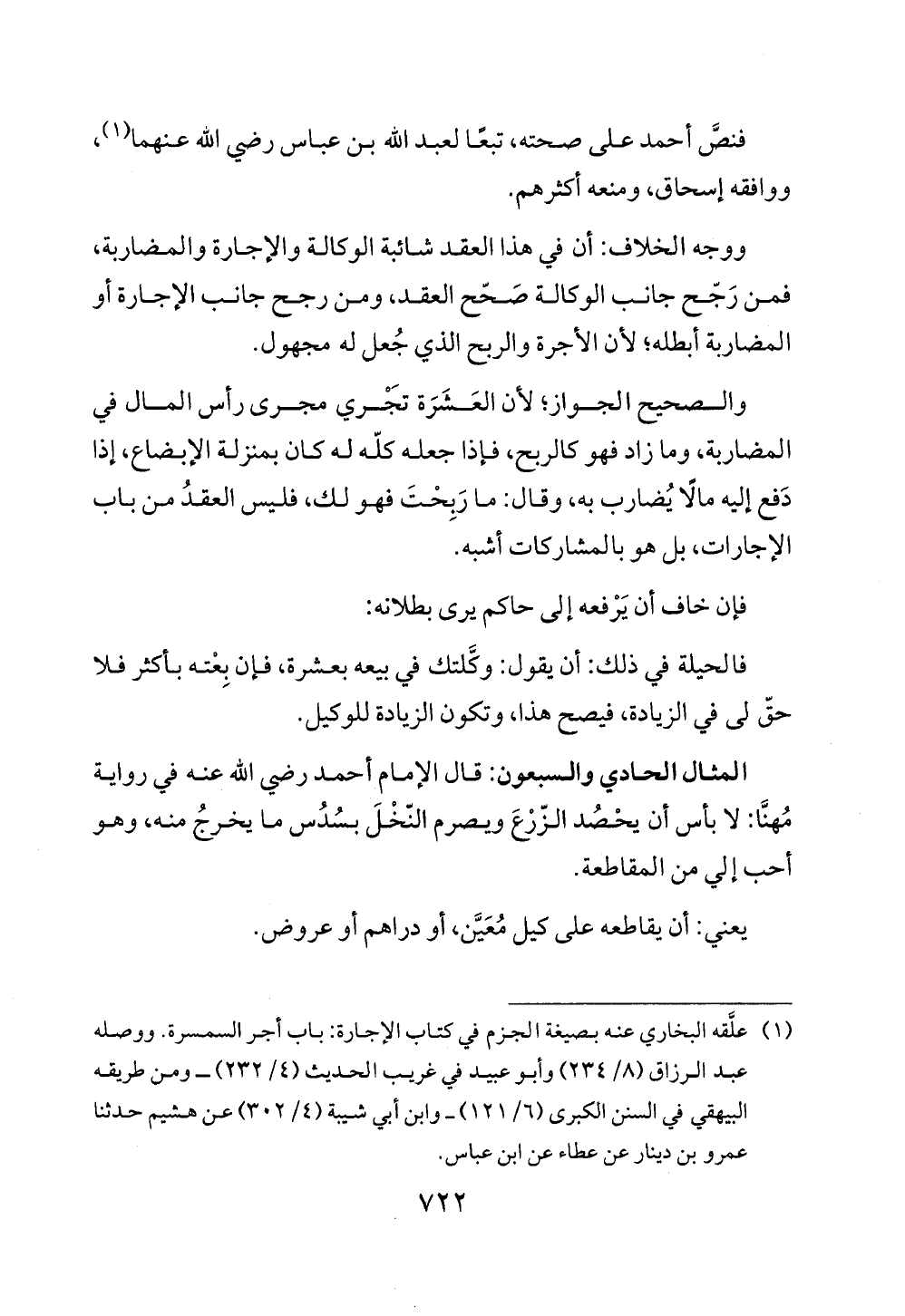 المثال الحادي والسبعون: قال الإمام أحمد رضي الله عنه في رواية مُهنَّا: لا بأس أن يحْصُد الزّرْعَ ويصرم النّخْلَ بسُدُس ما يخرجُ منه، وهو أحب إلي من المقاطعة.