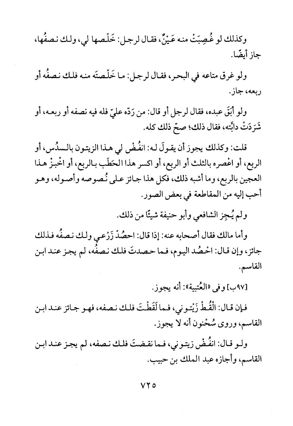 وأما مالك فقال أصحابه عنه: إذا قال: احصُدْ زَرْعي ولك نصفُه فذلك جائز، وإن قال: احْصُد اليوم، فما حصدتَ فلك نصفُه، لم يجز عند ابن القاسم.