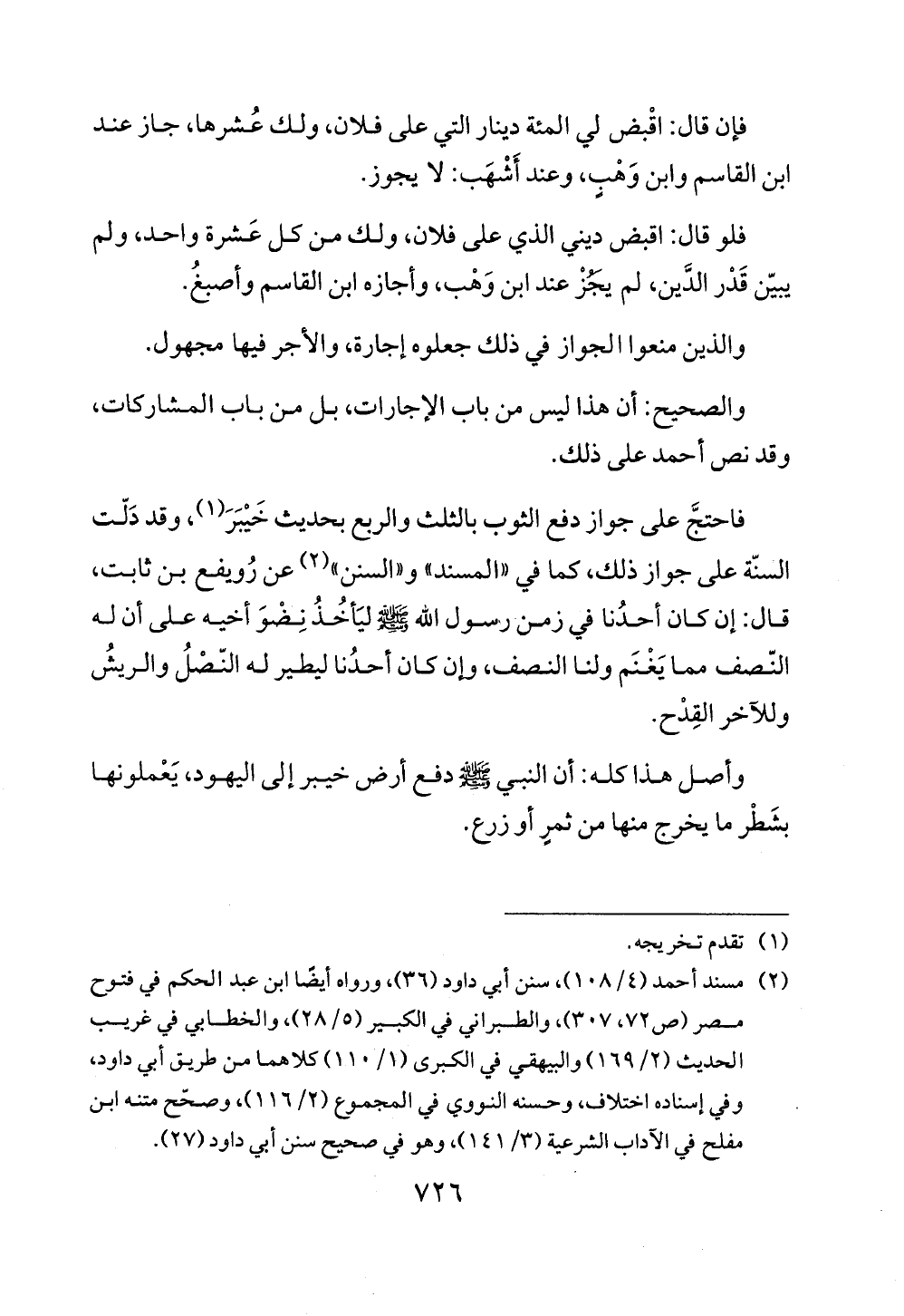 فاحتجَّ على جواز دفع الثوب بالثلث والربع بحديث خَيْبَرَ (¬1)، وقد دَلّت السنّة على جواز ذلك، كما في "المسند" و"السنن" (¬2) عن رُويفع بن ثابت، قالْ إن كان أحدُنا في زمن رسول الله - صلى الله عليه وسلم - ليَأخُذُ نِضْوَ أخيه على أن له النّصف مما يَغْنَم ولنا النصف، وإن كان أحدُنا ليطير له النّصْلُ والريشُ وللآخر القِدْح.